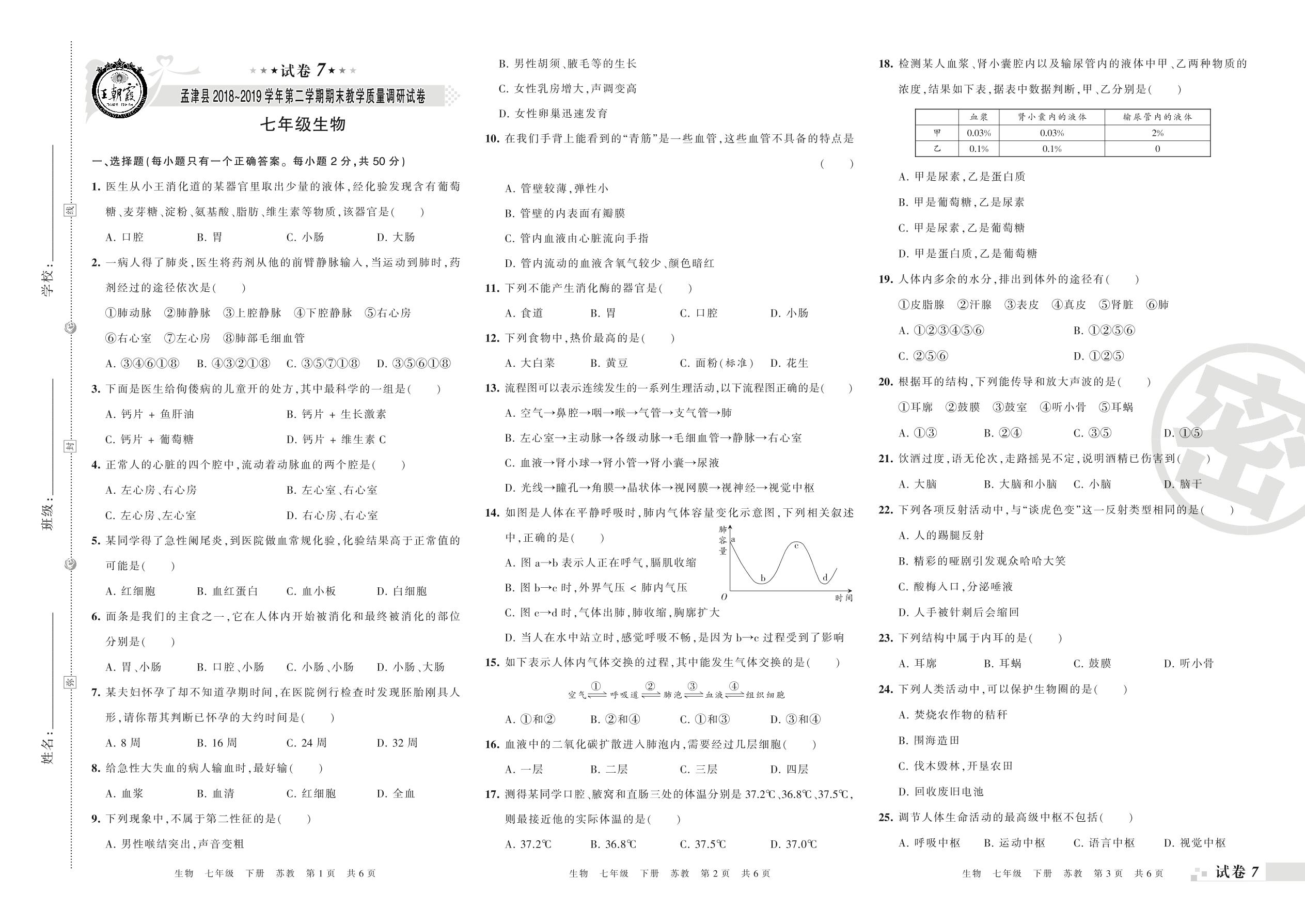 七年级生物苏教版下册期末卷