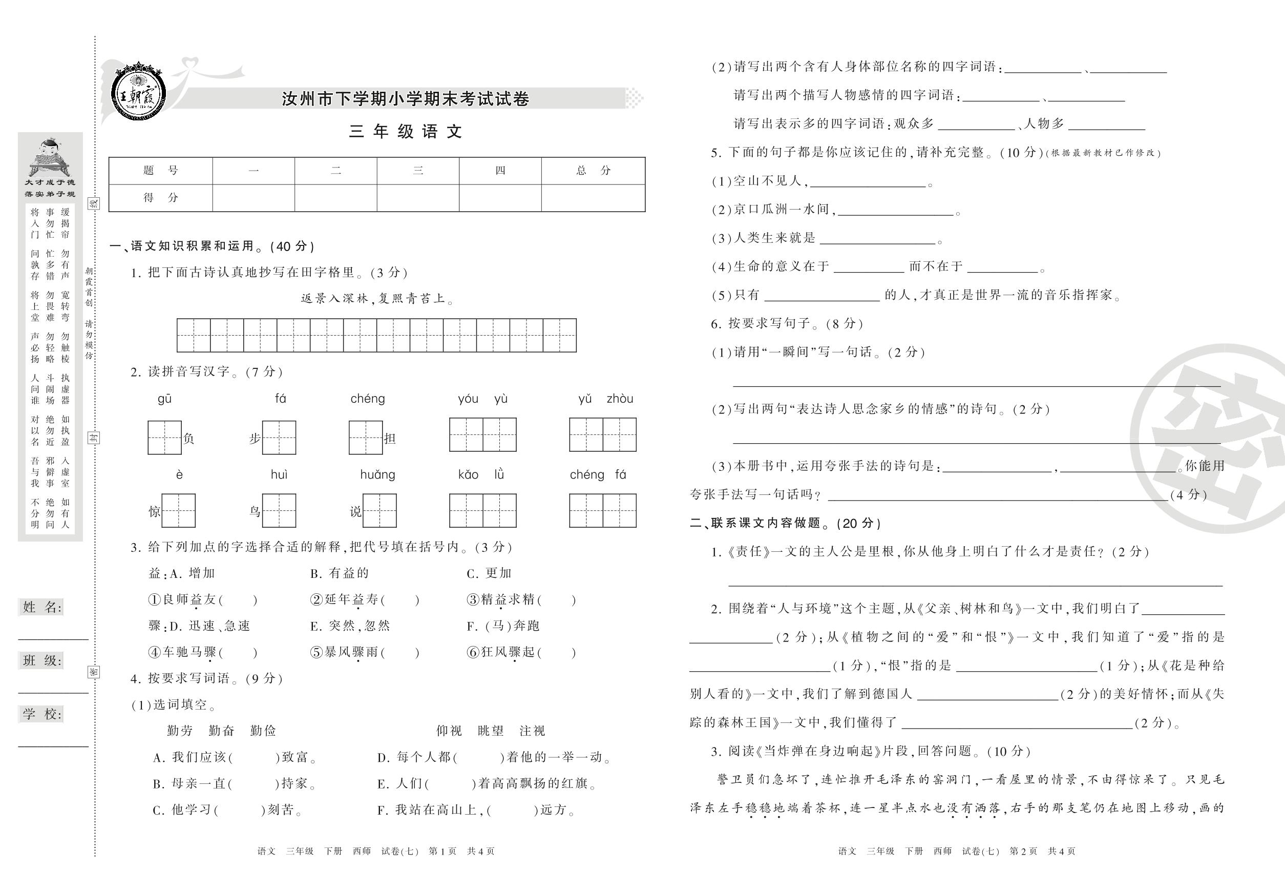 2015-2016学年第二学期汝州市三年级语文试卷(西师版)【7】
