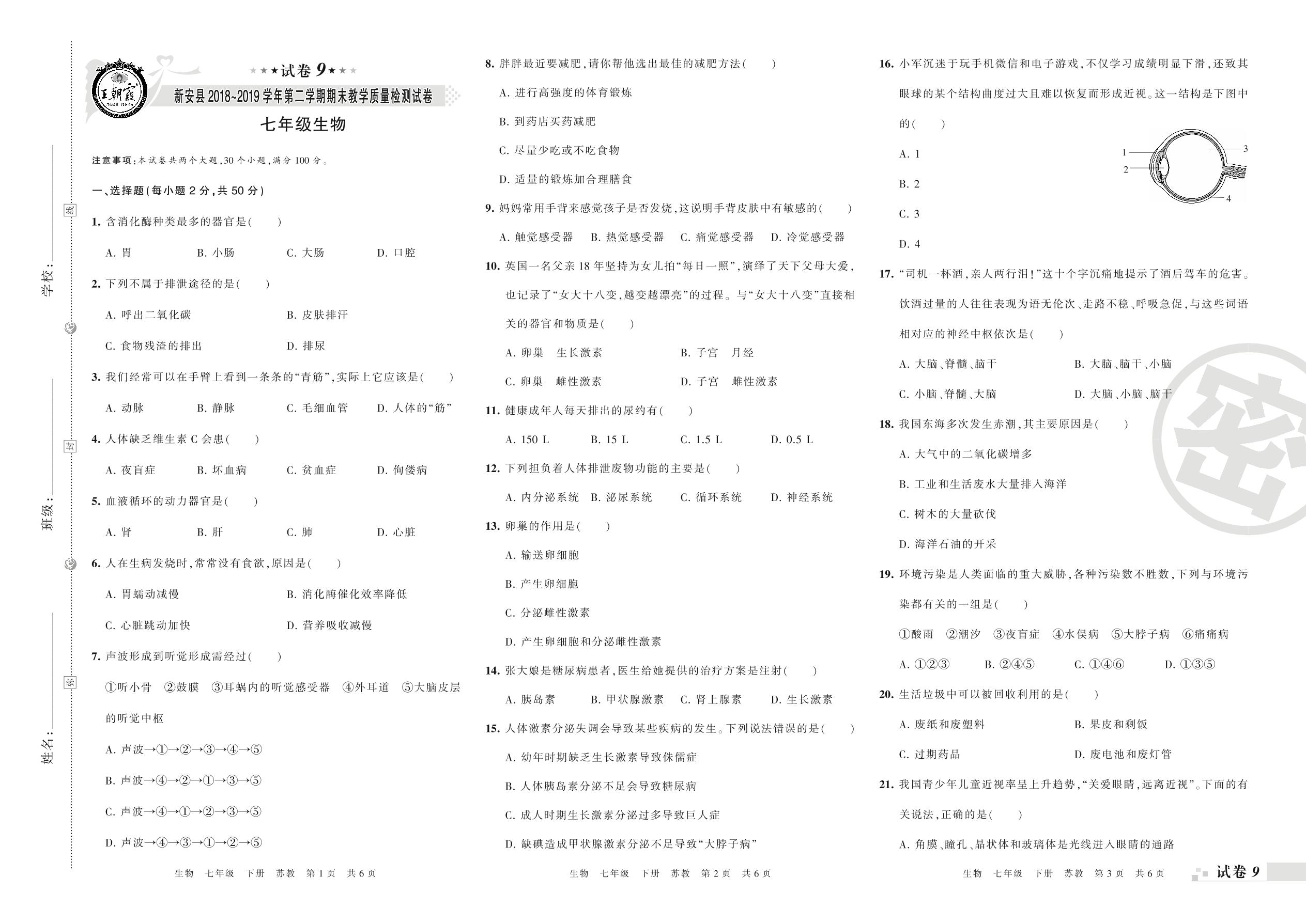 2018-2019学年第二学期洛阳市新安县七年级生物试卷(苏教版)【9】