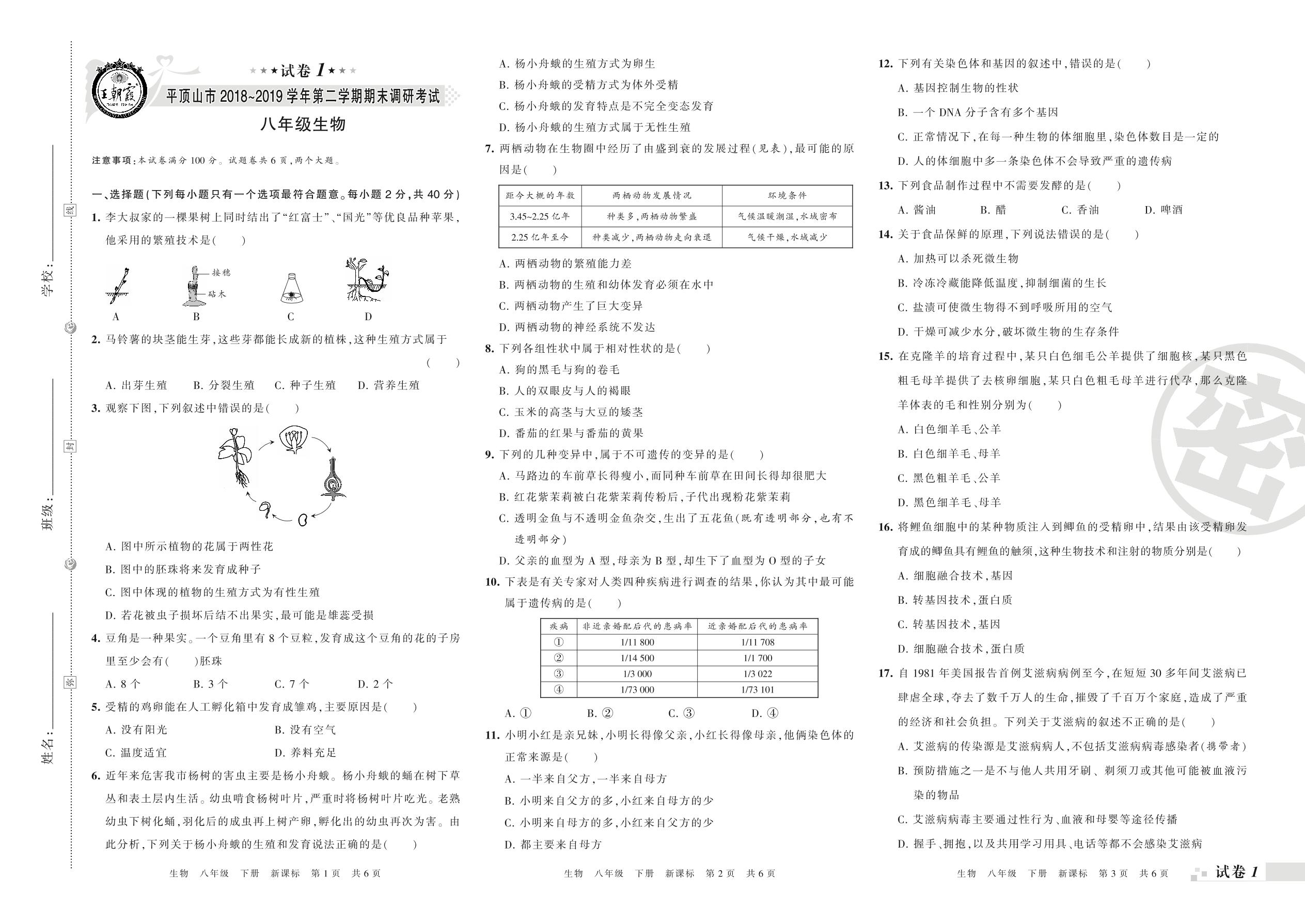 2018-2019学年第二学期平顶山市八年级生物试卷(新课标版)【1】