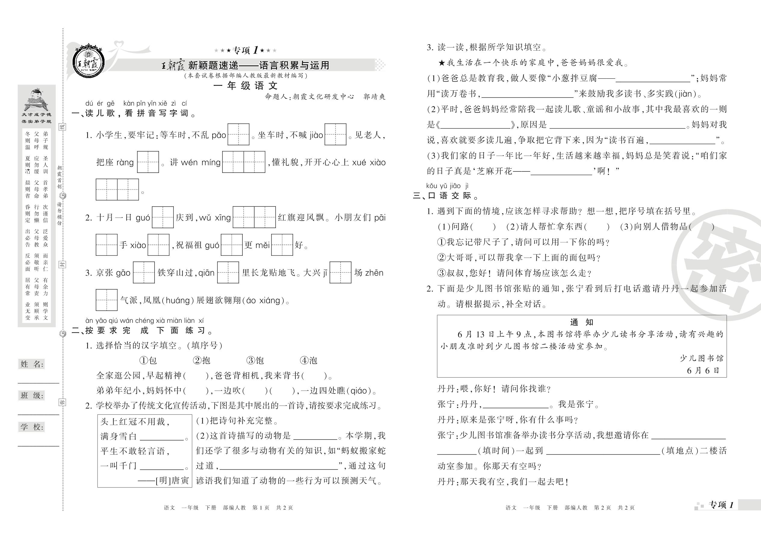 王朝霞期末专项卷——新颖题速递:语言积累与运用、非连续性文本阅读一年级下册语文(人教版)_R210731180043【0】