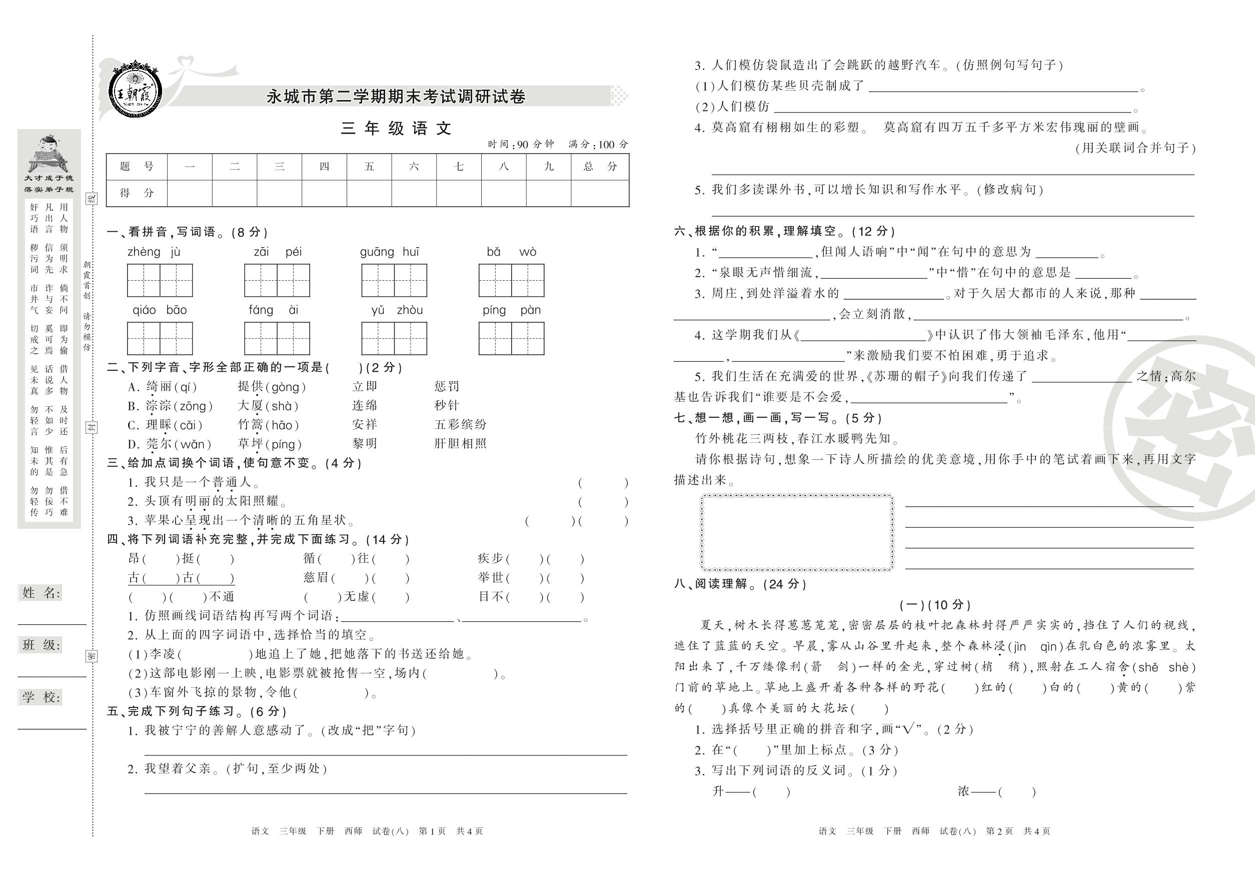 2015-2016学年第二学期永城市三年级语文试卷(西师版)【8】