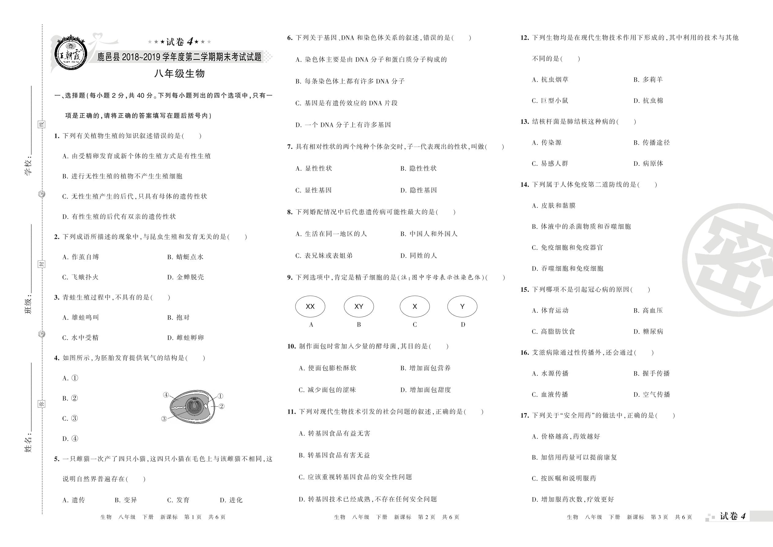 2018-2019学年第二学期周口市鹿邑县八年级生物试卷(新课标版)【4】