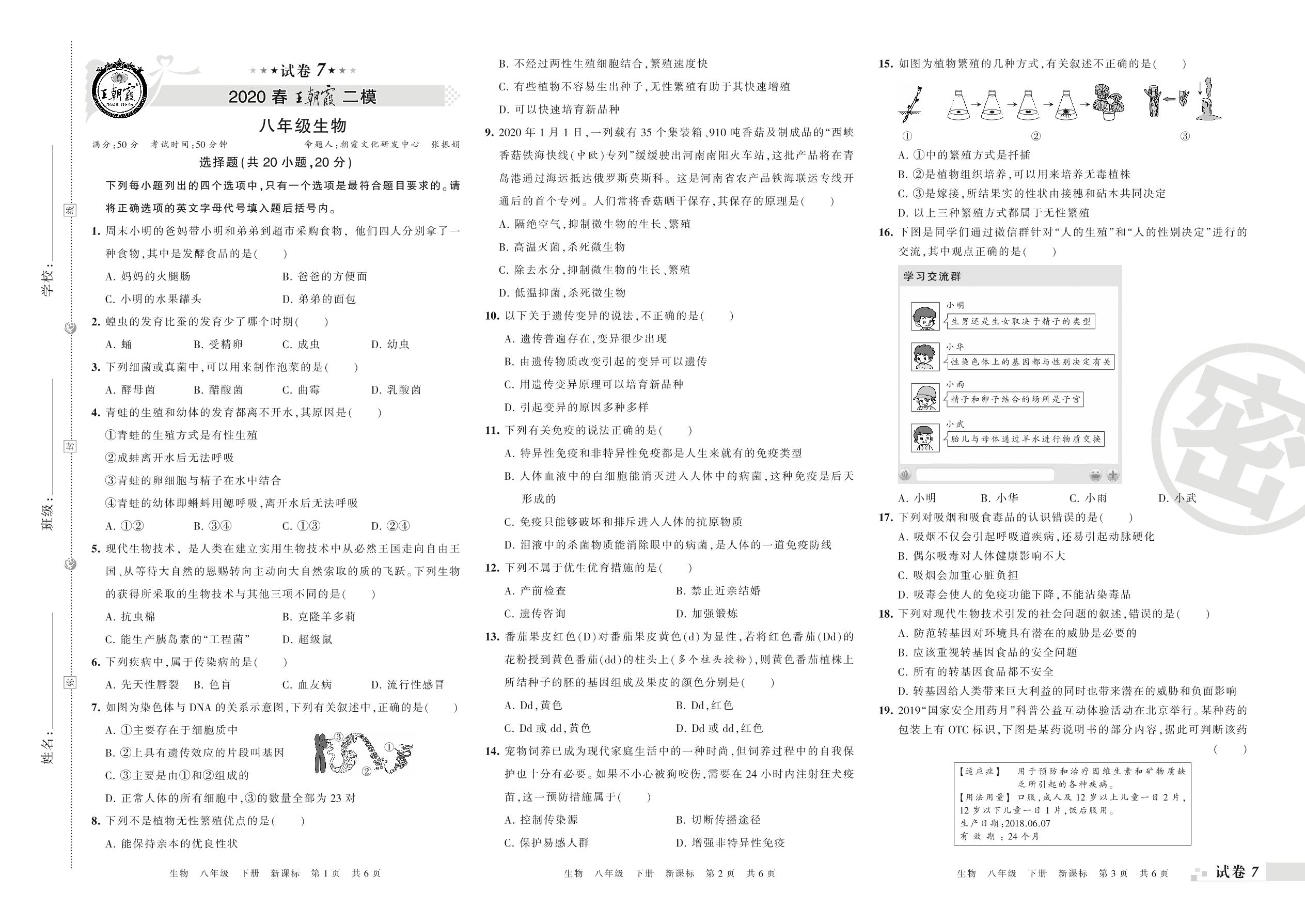 王朝霞期末模拟卷八年级下册生物(新课标版)_R21081295620【7】