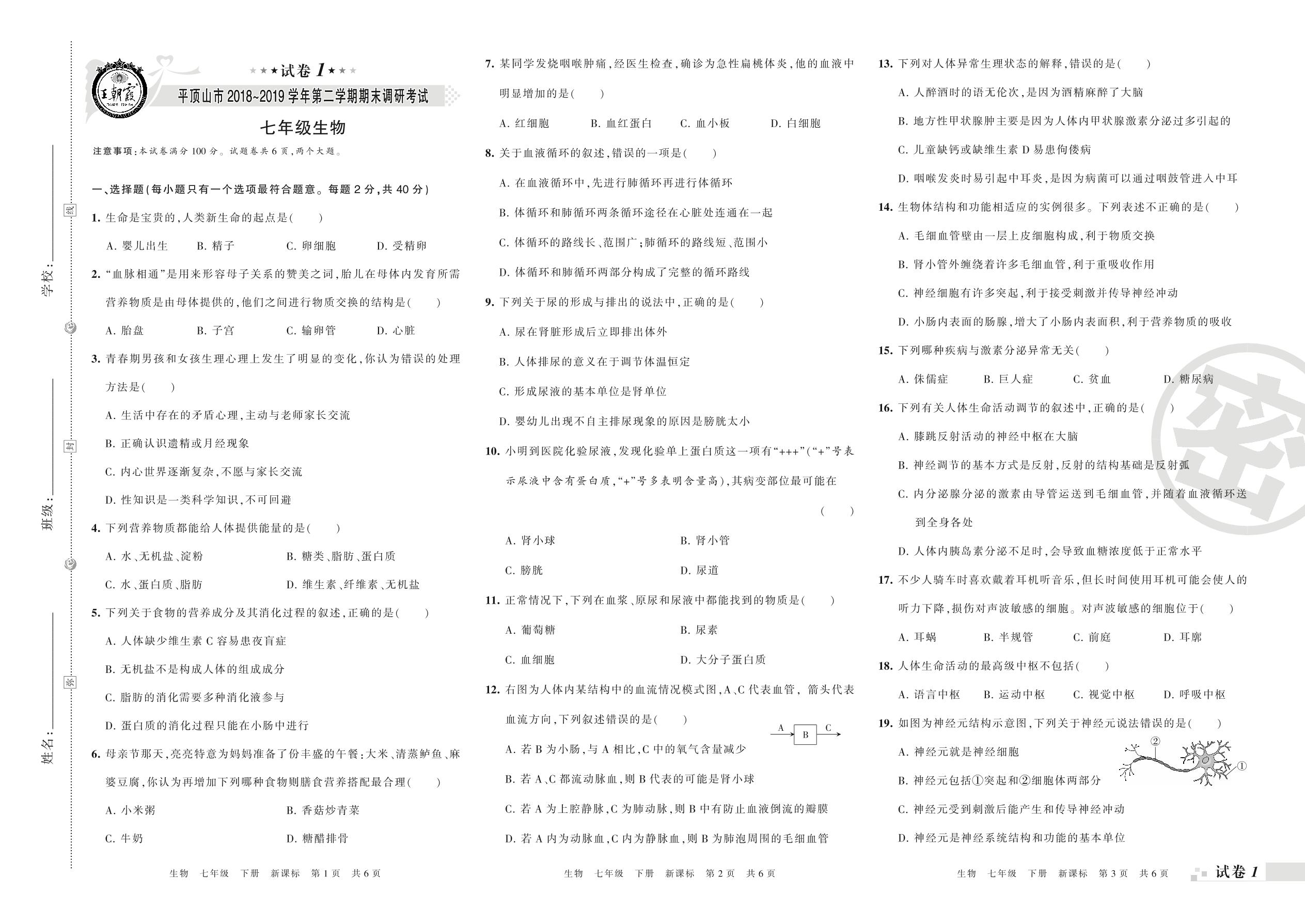 2018-2019学年第二学期平顶山市七年级生物试卷(新课标版)【1】
