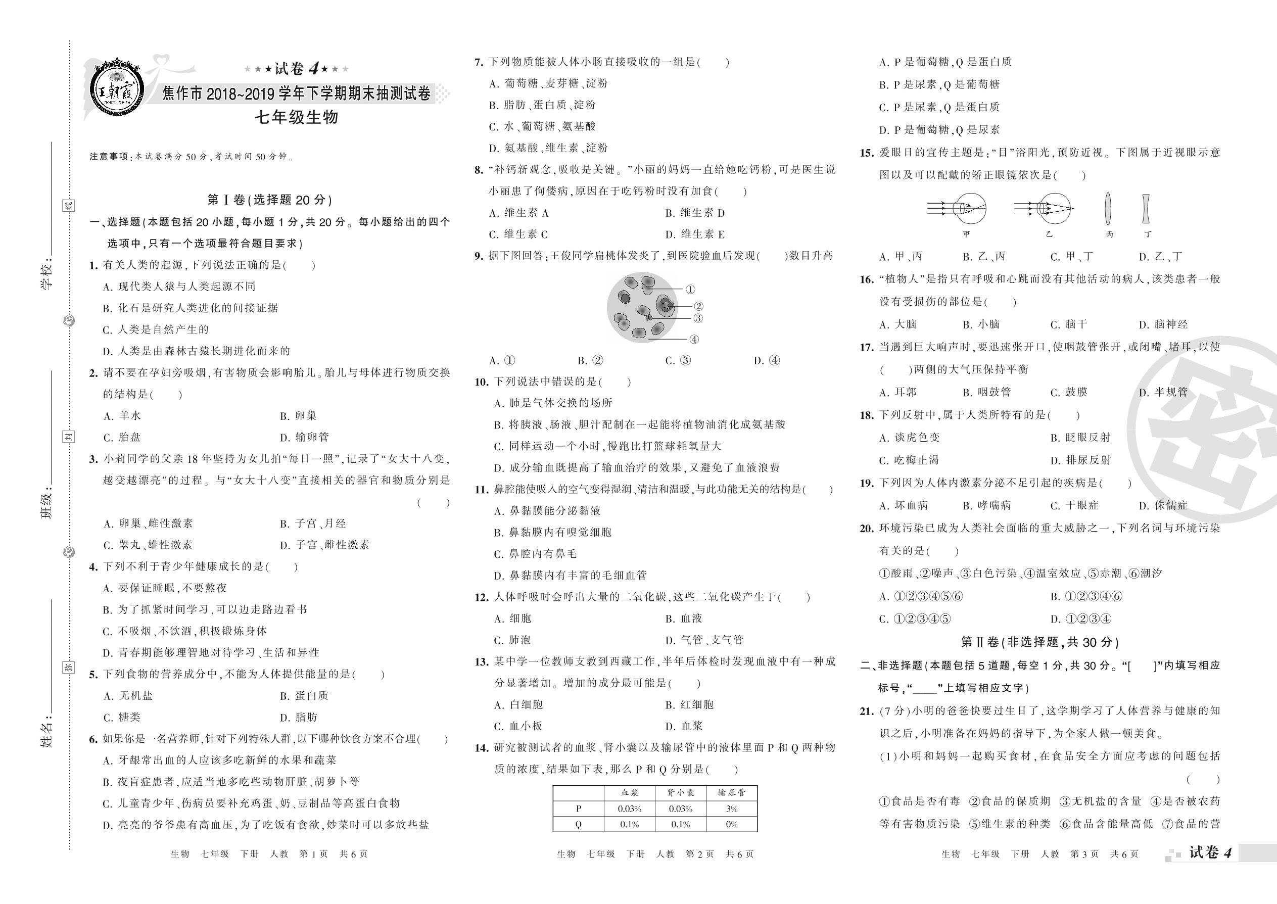 2018-2019学年第二学期焦作市七年级生物试卷(人教版)【4】