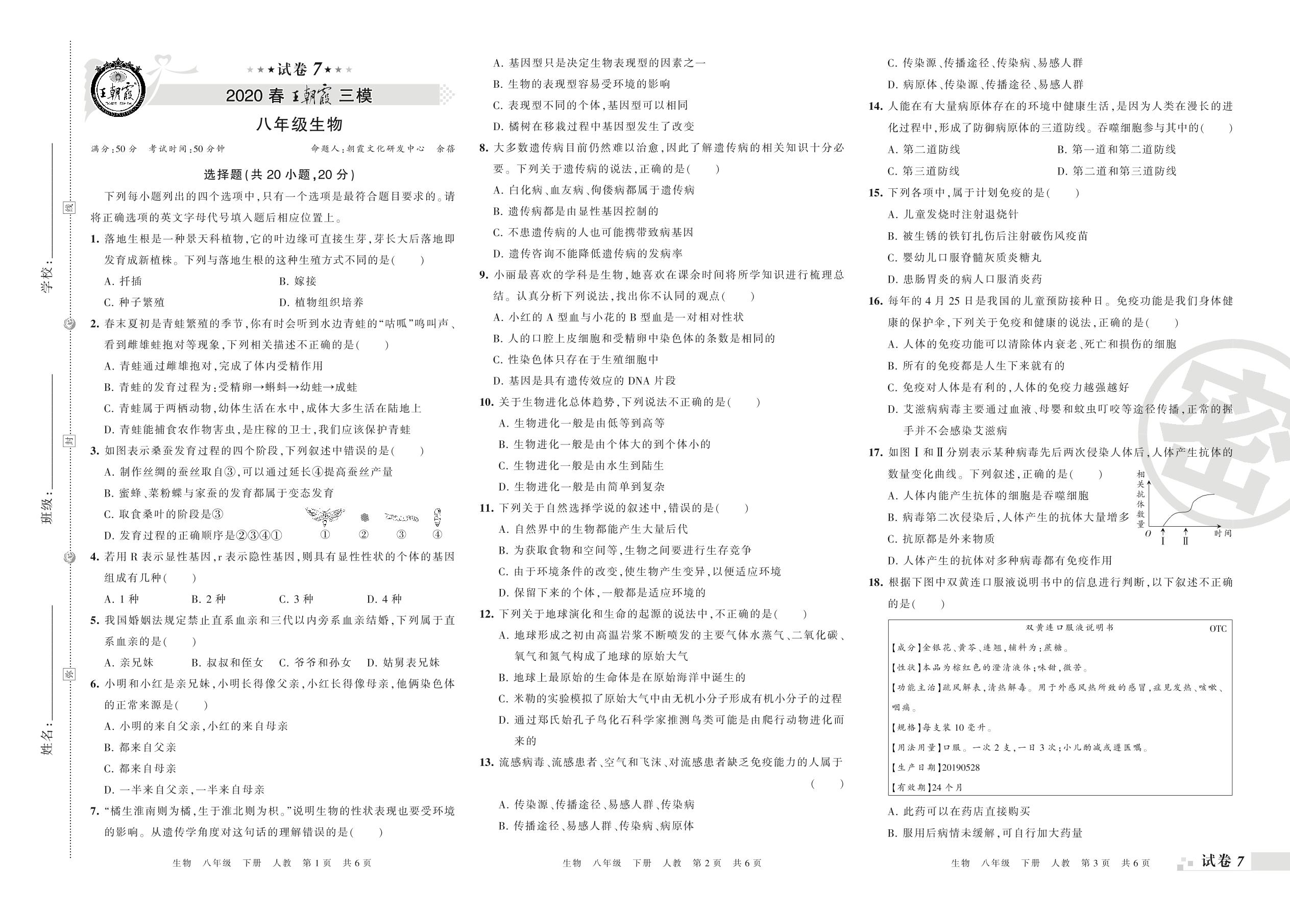 王朝霞期末模拟卷八年级下册生物(人教版)【7】