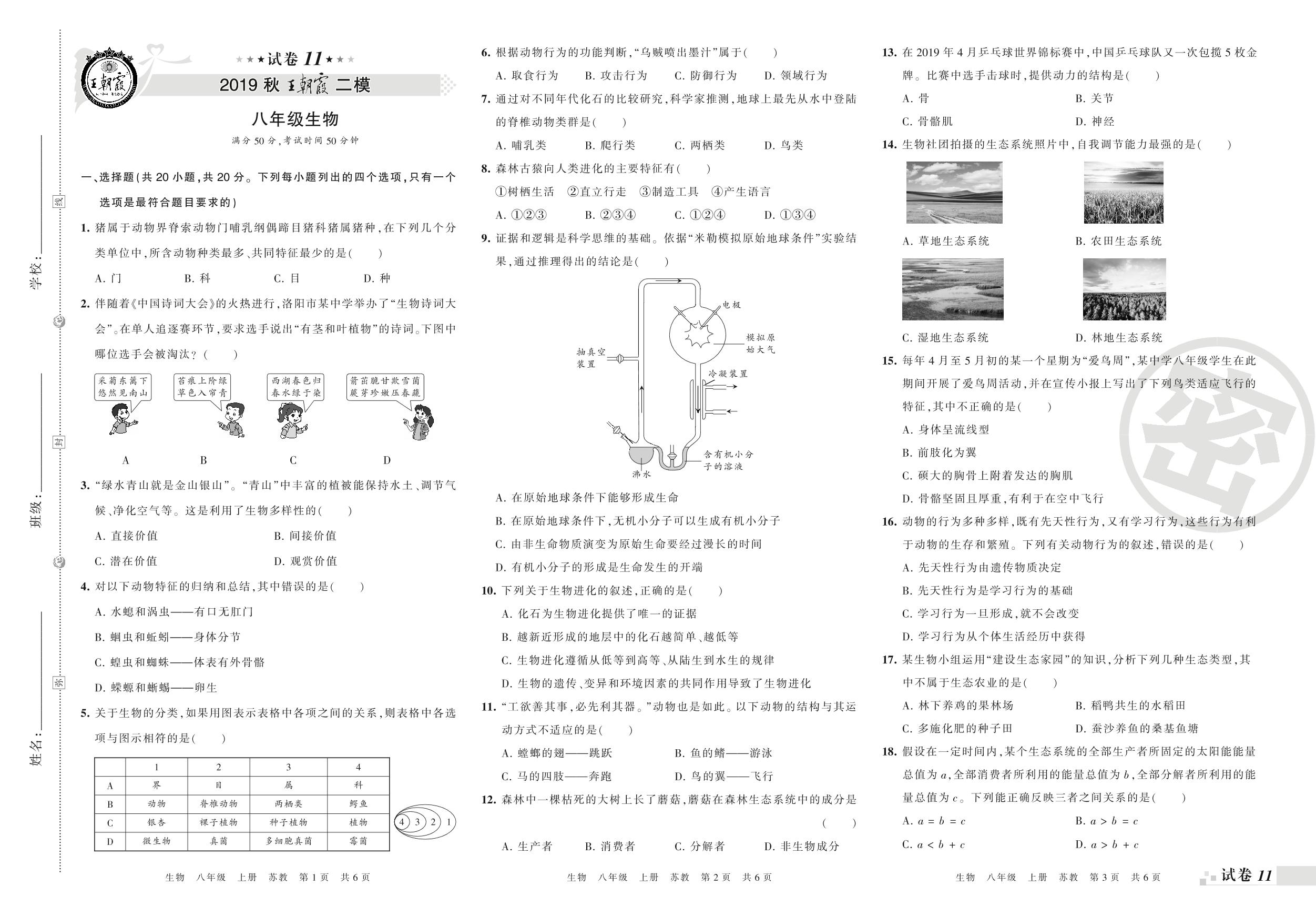 王朝霞期末模拟卷八年级上册生物(苏教版)【11】