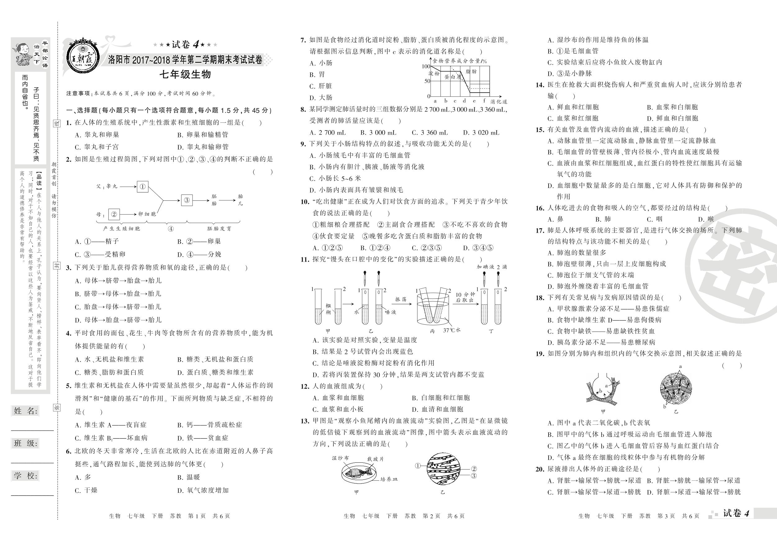 2017-2018学年第二学期洛阳市七年级生物试卷(苏教版)【4】