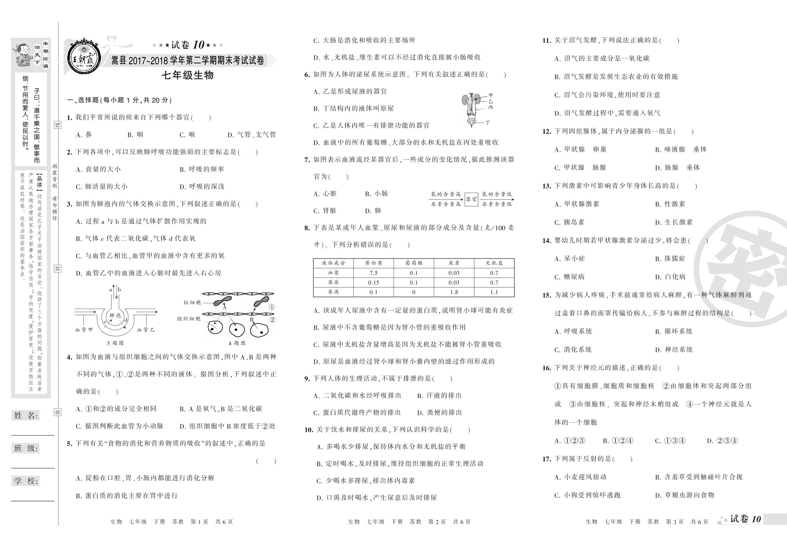 2017-2018学年第二学期洛阳市嵩县七年级生物试卷(苏教版)【10】