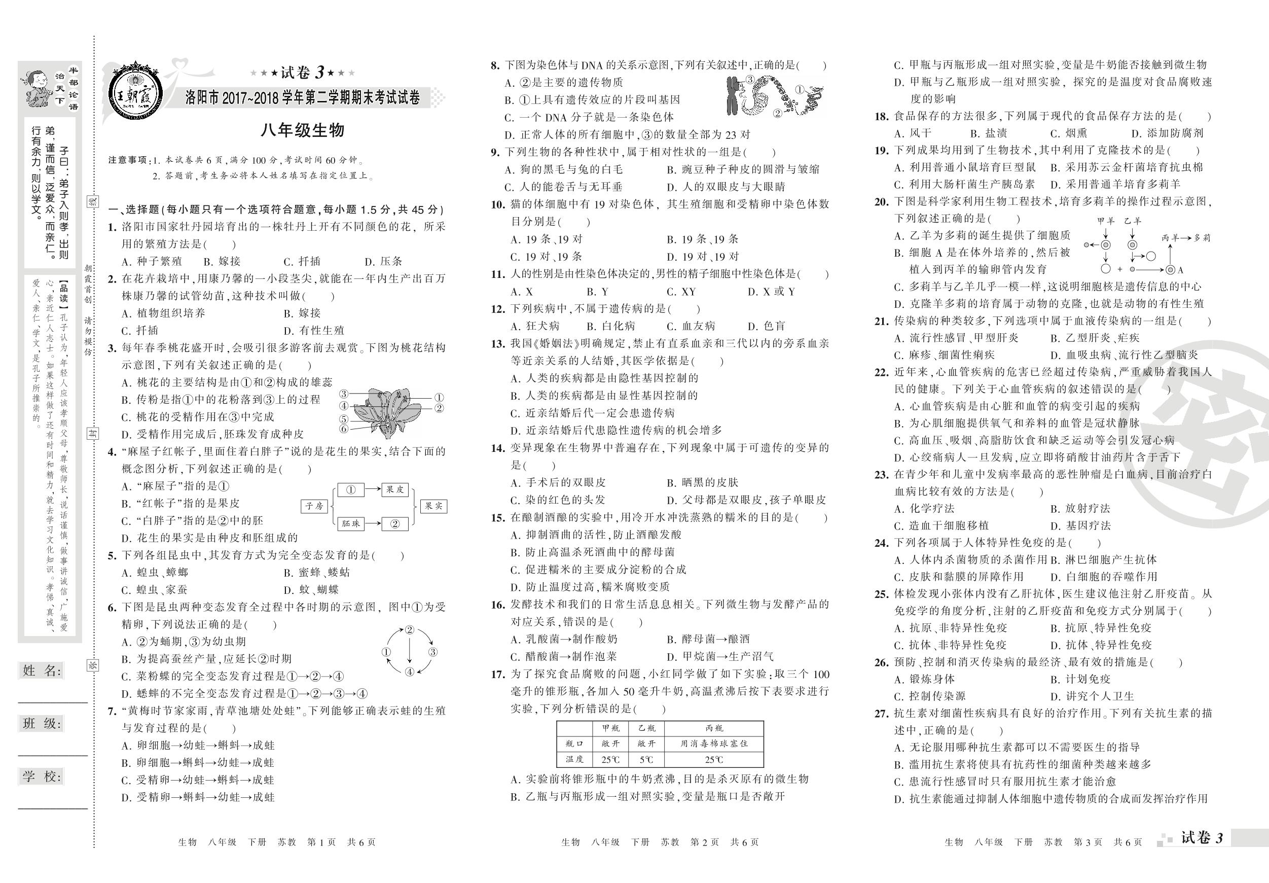 2017-2018学年第二学期洛阳市八年级生物试卷(苏教版)【3】