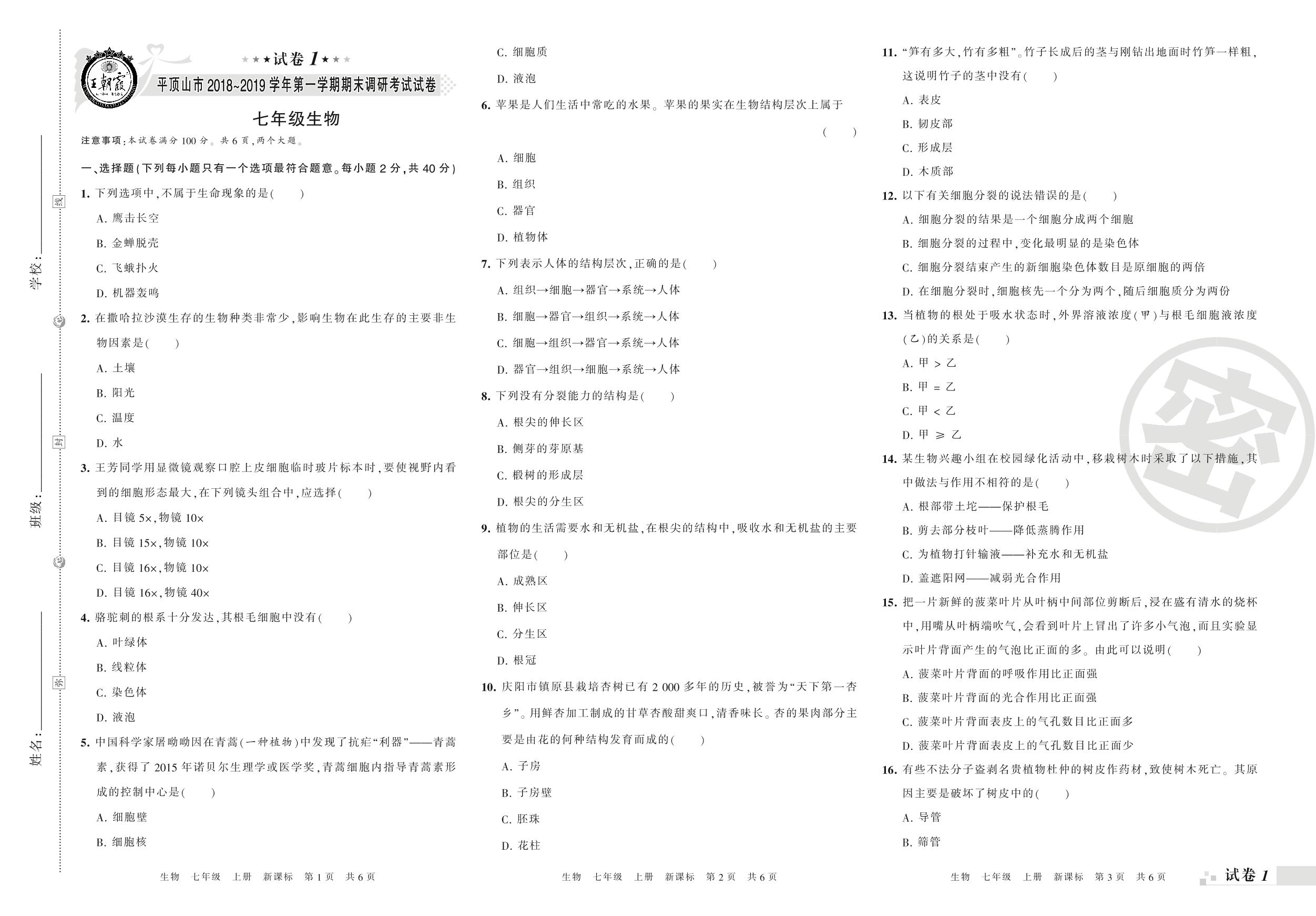 2018-2019学年第一学期平顶山市七年级生物试卷(新课版)【1】