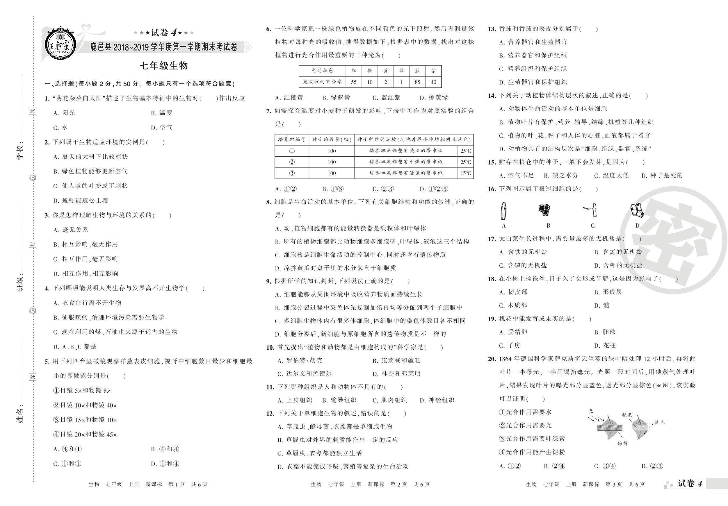 2018-2019学年第一学期周口市鹿邑县七年级生物试卷(新课版)【4】