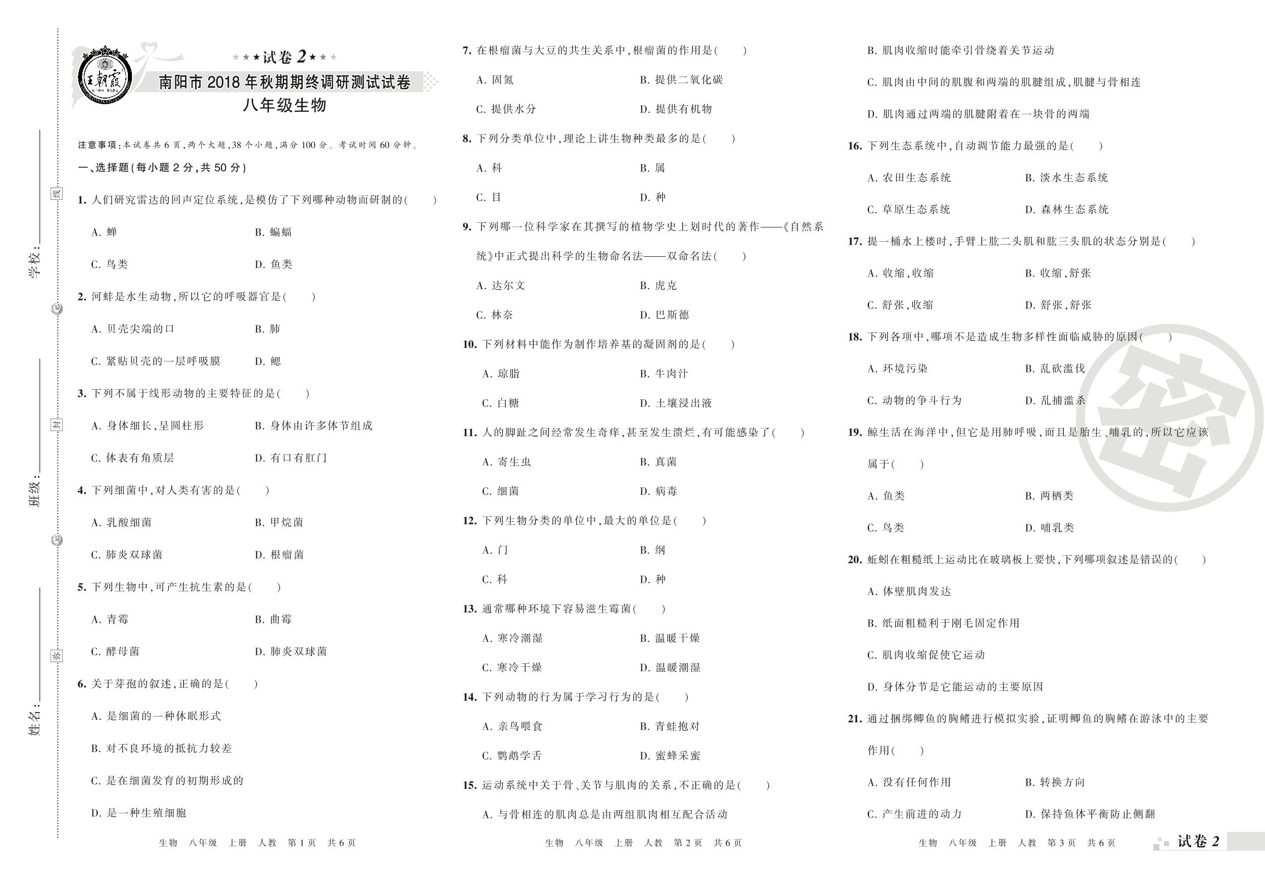 2018-2019学年第一学期南阳市八年级生物试卷(人教版)【2】