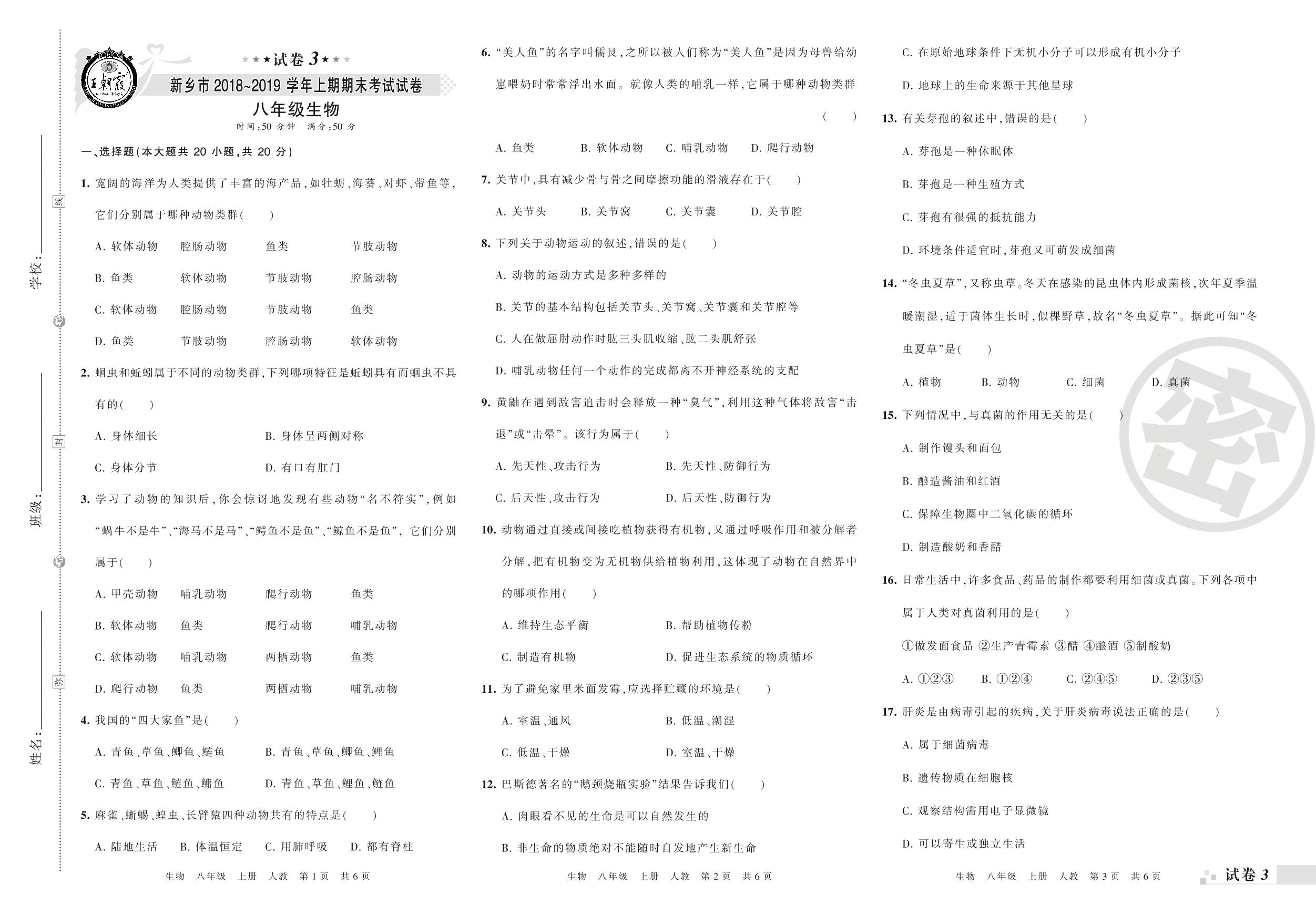 2018-2019学年第一学期新乡市八年级生物试卷(人教版)【3】