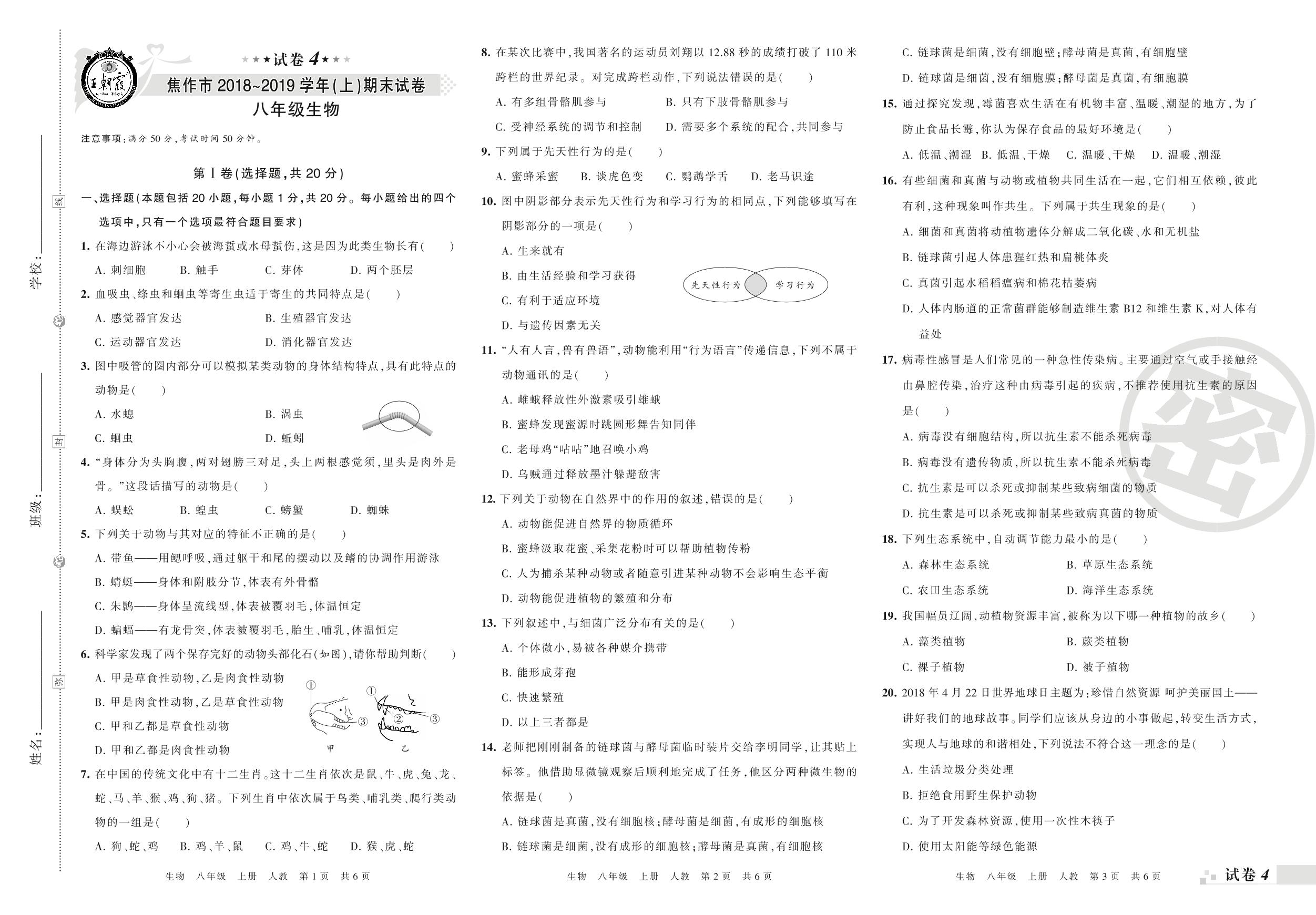2018-2019学年第一学期焦作市八年级生物试卷(人教版)【4】