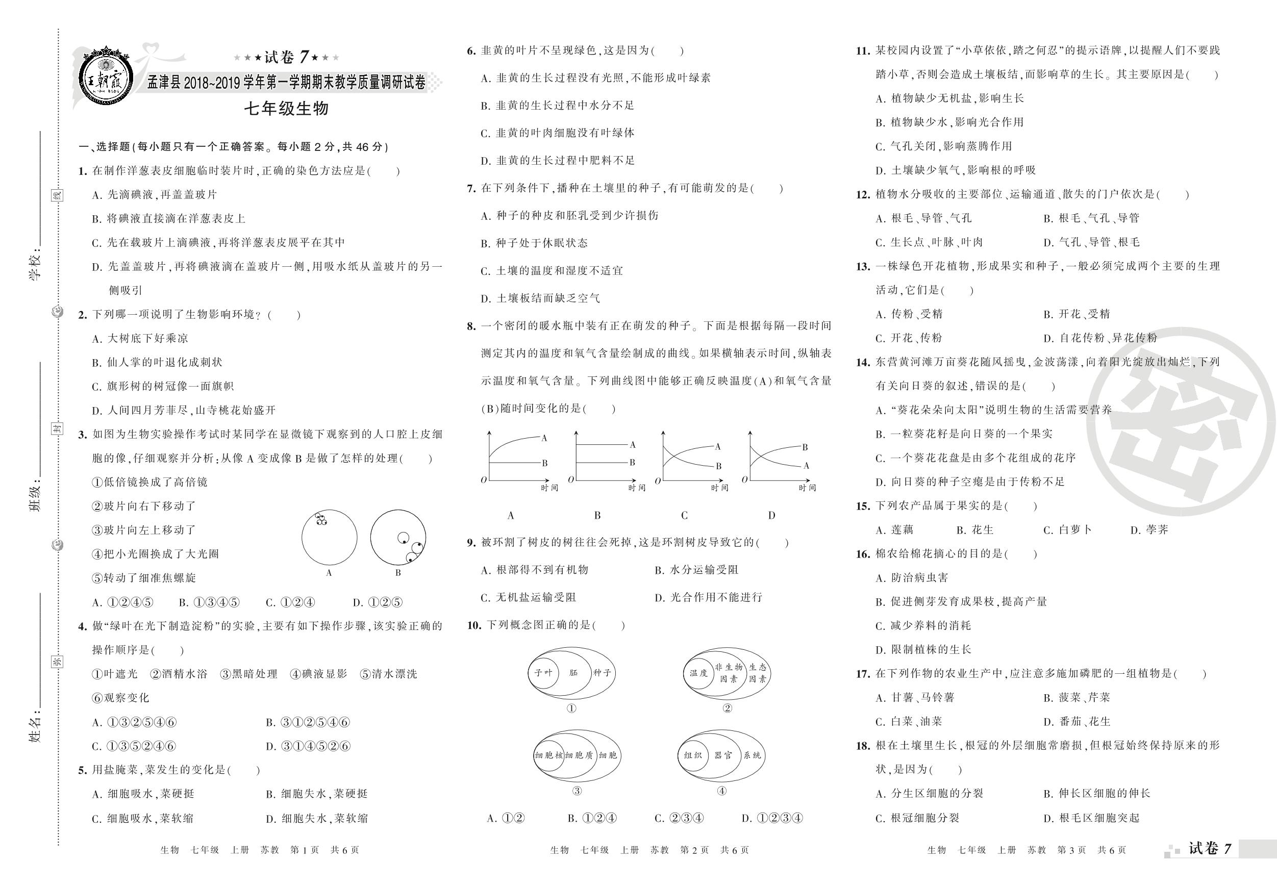 2018-2019学年第一学期洛阳市孟津县七年级生物试卷(苏教版)【7】
