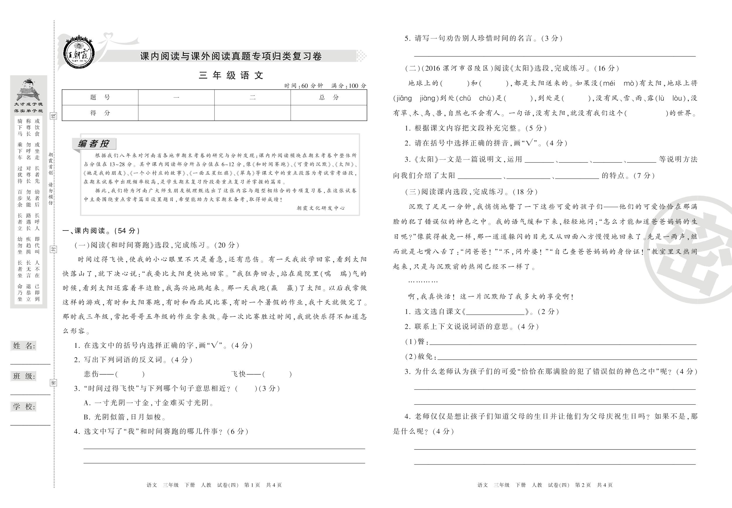 王朝霞期末专项卷三年级下册语文(人教版)_R21080194849【4】