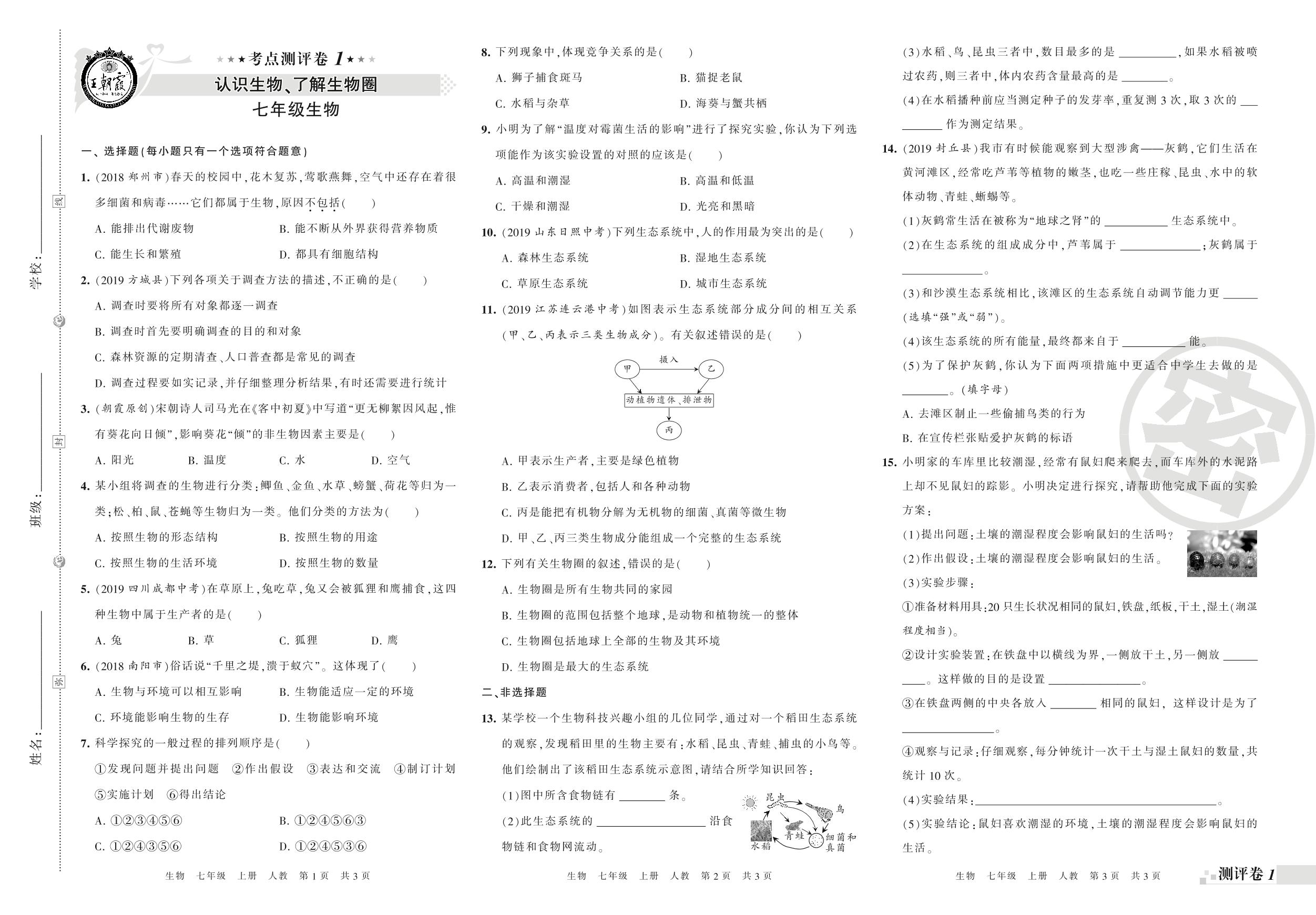 王朝霞期末测评卷——认识生物、了解生物圈、细胞是生命活动的基本单位七年级上册生物(人教版)【0】
