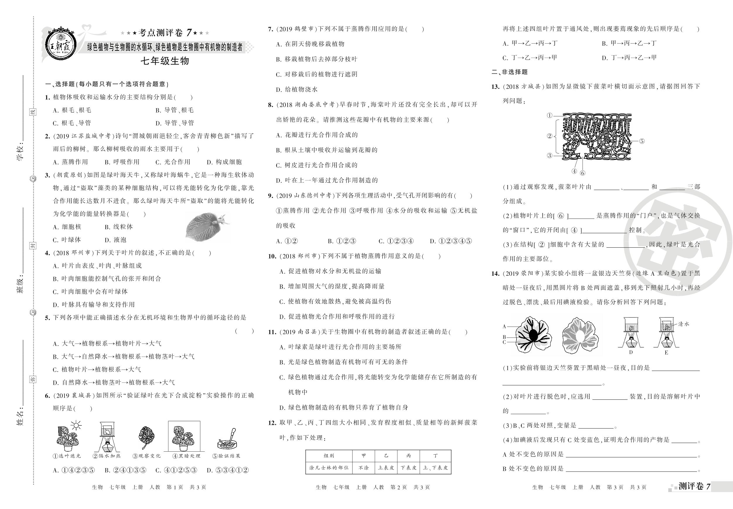 王朝霞期末测评卷——绿色植物与生物圈的水循环、绿色植物是生物圈中的有机物制造者、绿色植物与生物圈中的碳—氧平衡、爱护植被,绿化祖国七年级上册生物(人教版)【0】