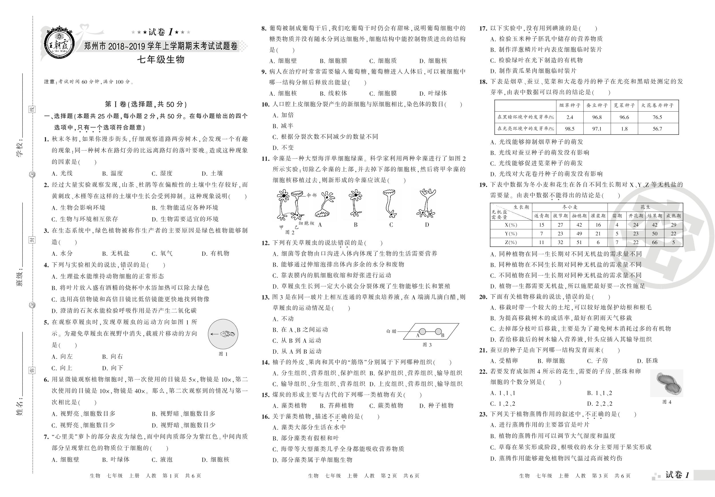 2018-2019学年第一学期郑州市七年级生物试卷(人教版)【1】