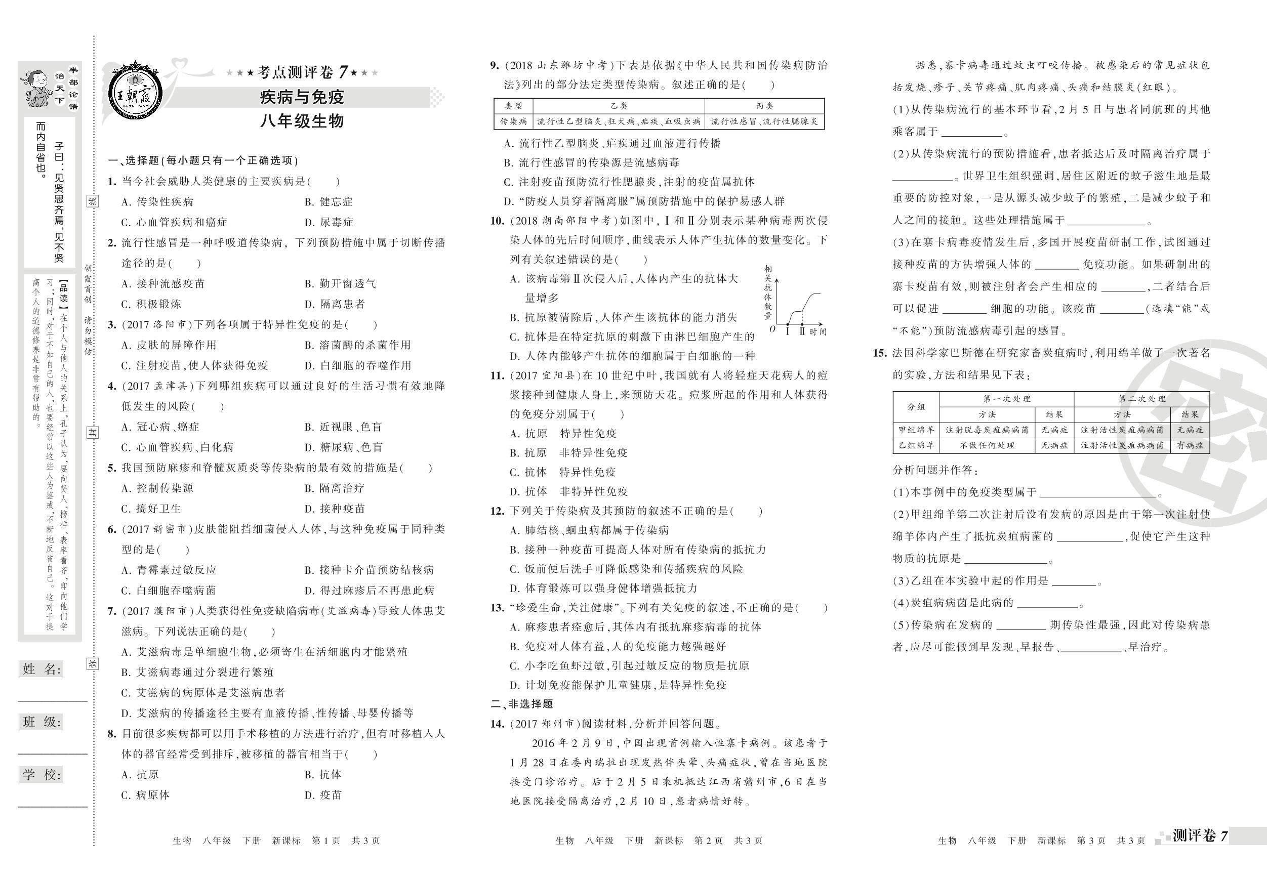 王朝霞期末测评卷——疾病与免疫、珍爱生命八年级下册生物(新课版)【0】