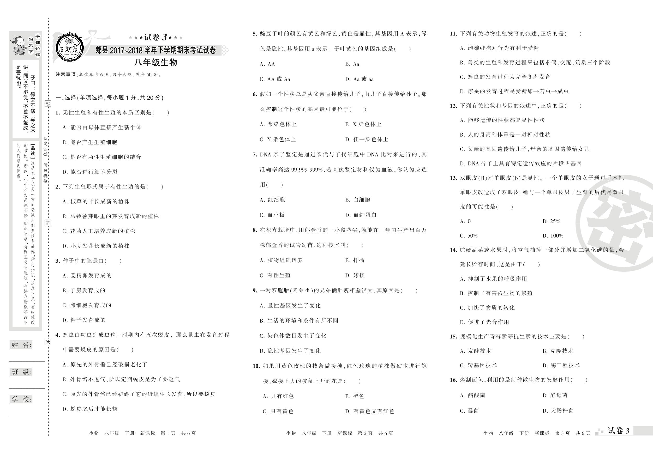 2017-2018学年第二学期平顶山市郏县八年级生物试卷(新课版)【3】
