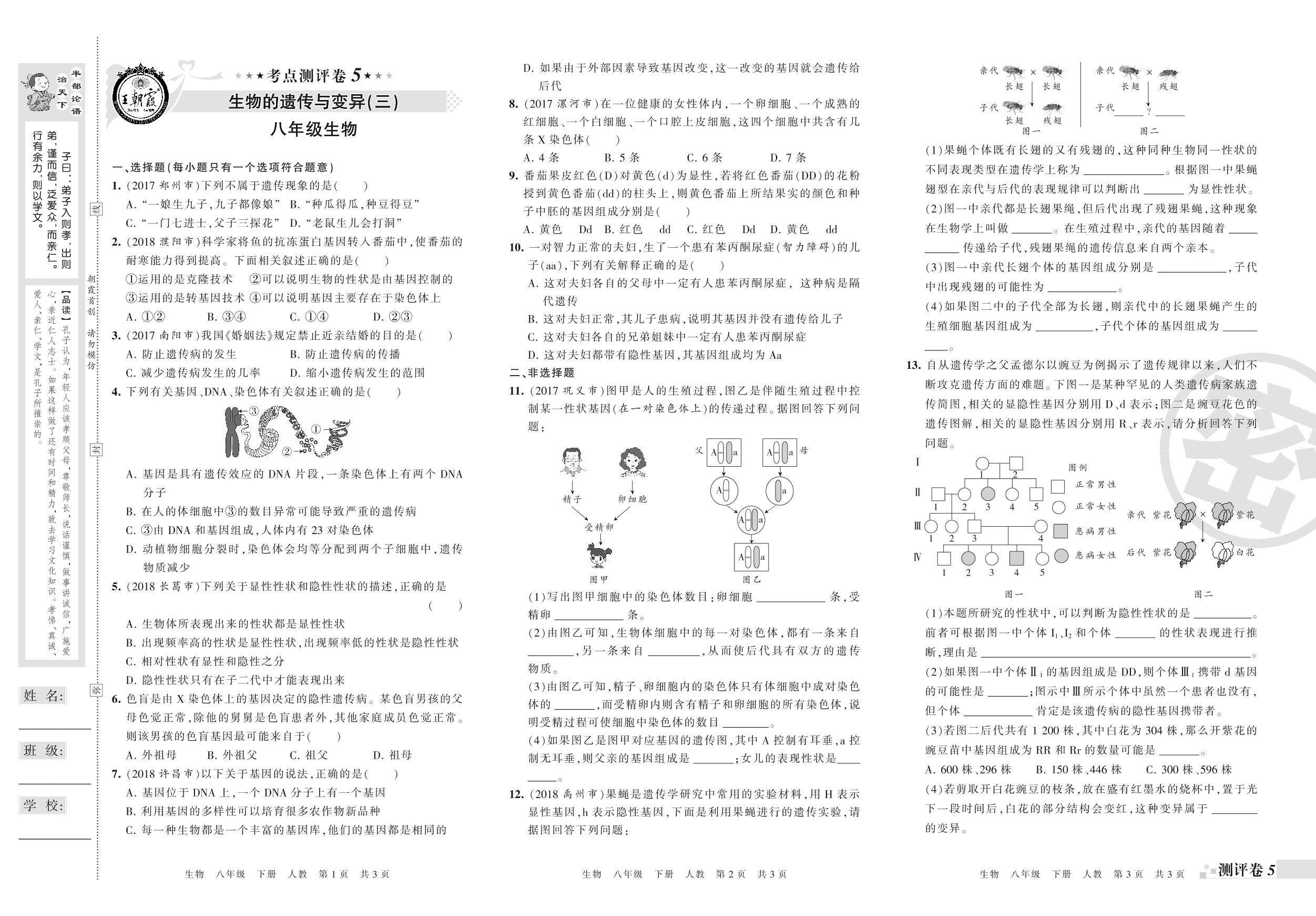 王朝霞期末测评卷——生物的遗传与变异(三)、生物起源和生物进化八年级下册生物(人教版)【0】