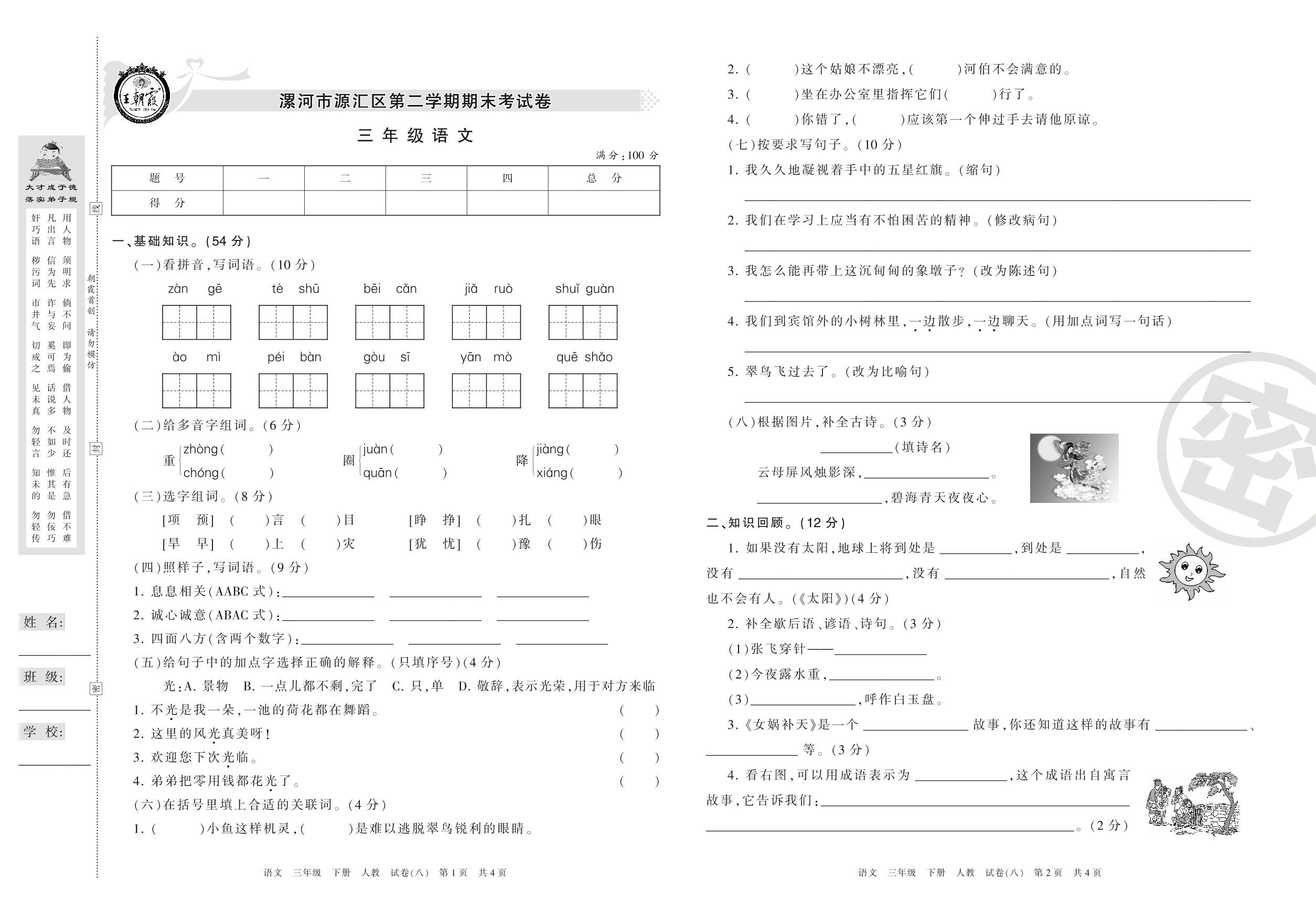 2015-2016学年第二学期漯河市源汇区三年级语文试卷(人教版)【8】