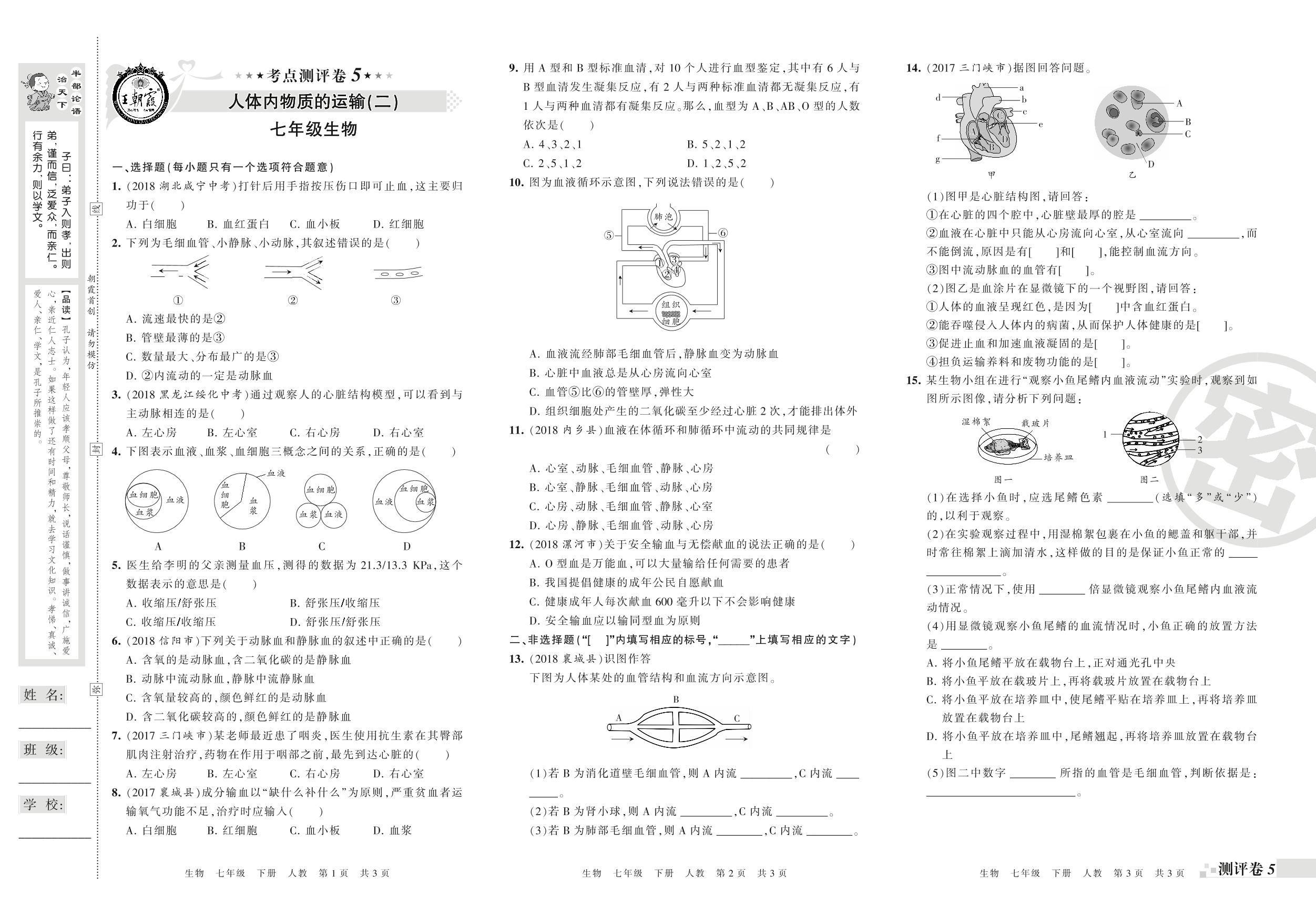 王朝霞期末测评卷——人体内物质的运输(二)、人体内废物的排出七年级下册生物(人教版)_R210812101554【0】