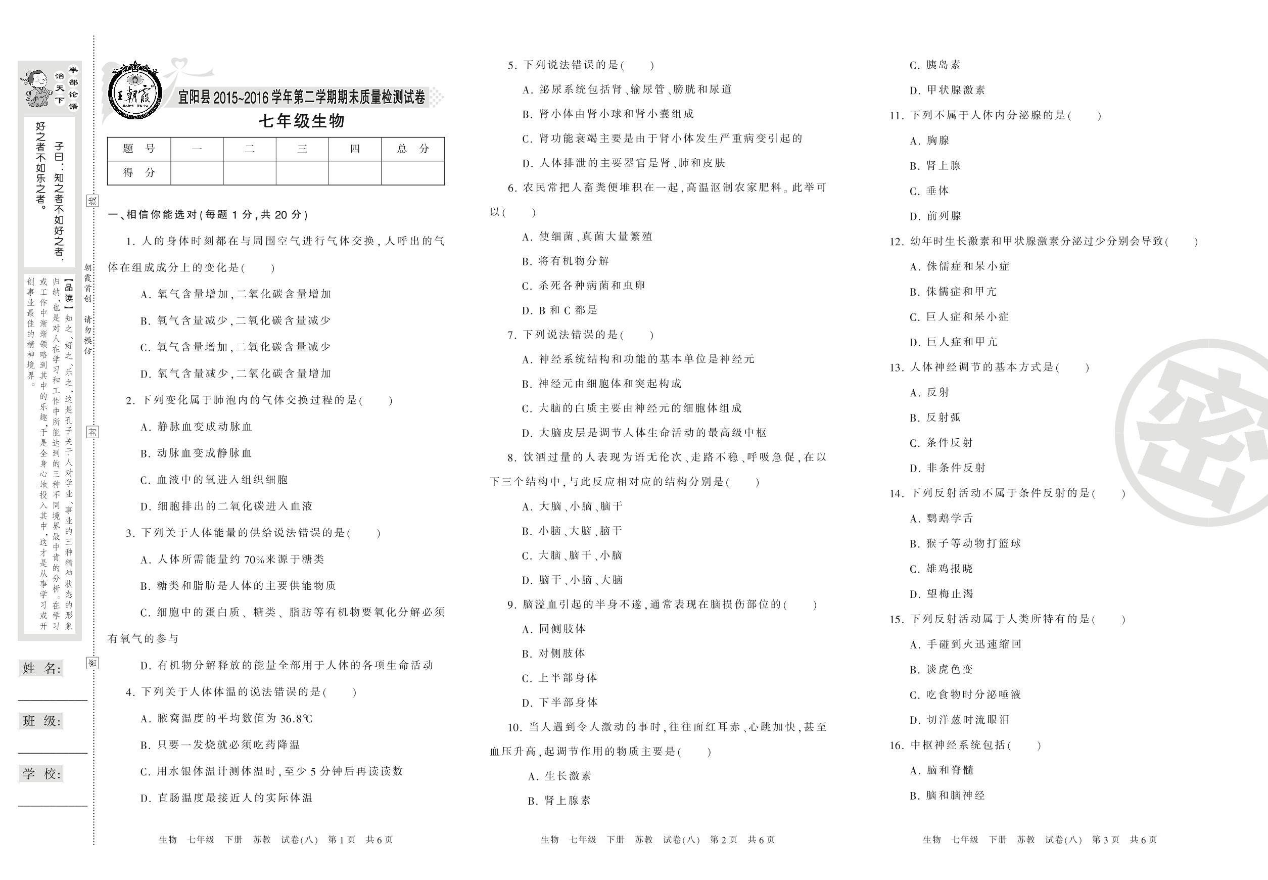 七年级生物苏教版下册期末卷