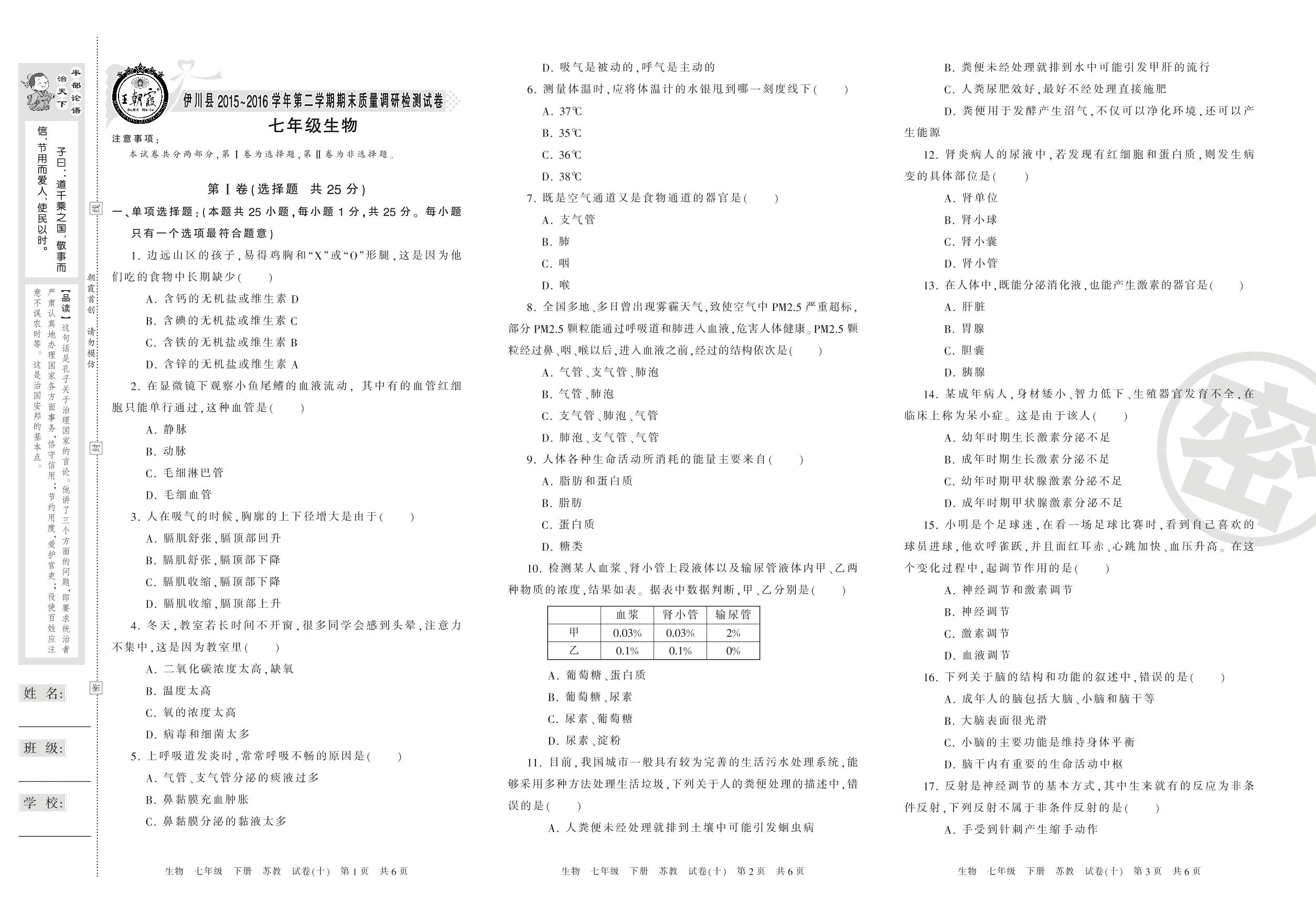 七年级生物苏教版下册期末卷