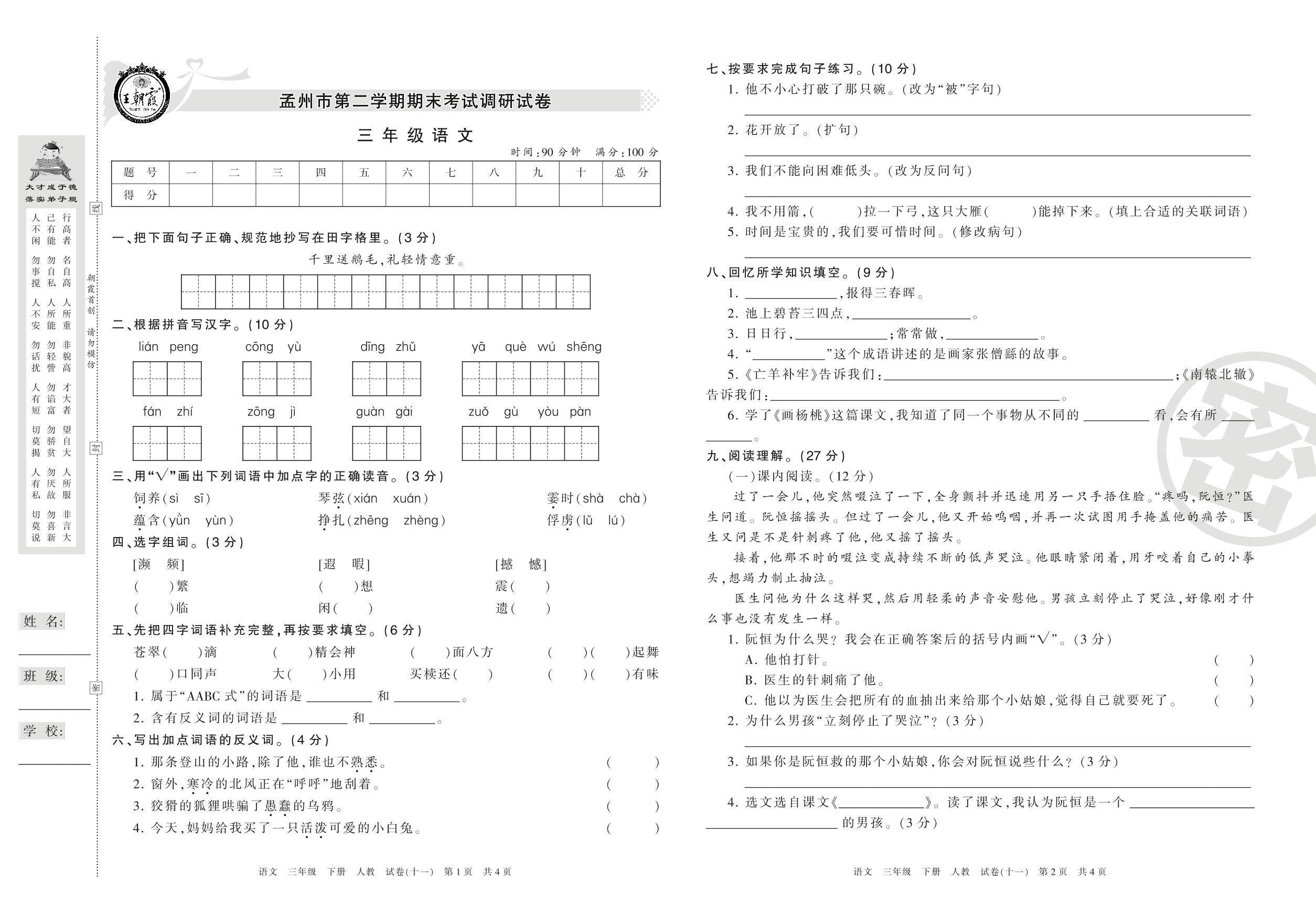 2015-2016学年第二学期孟州市三年级语文试卷(人教版)【11】