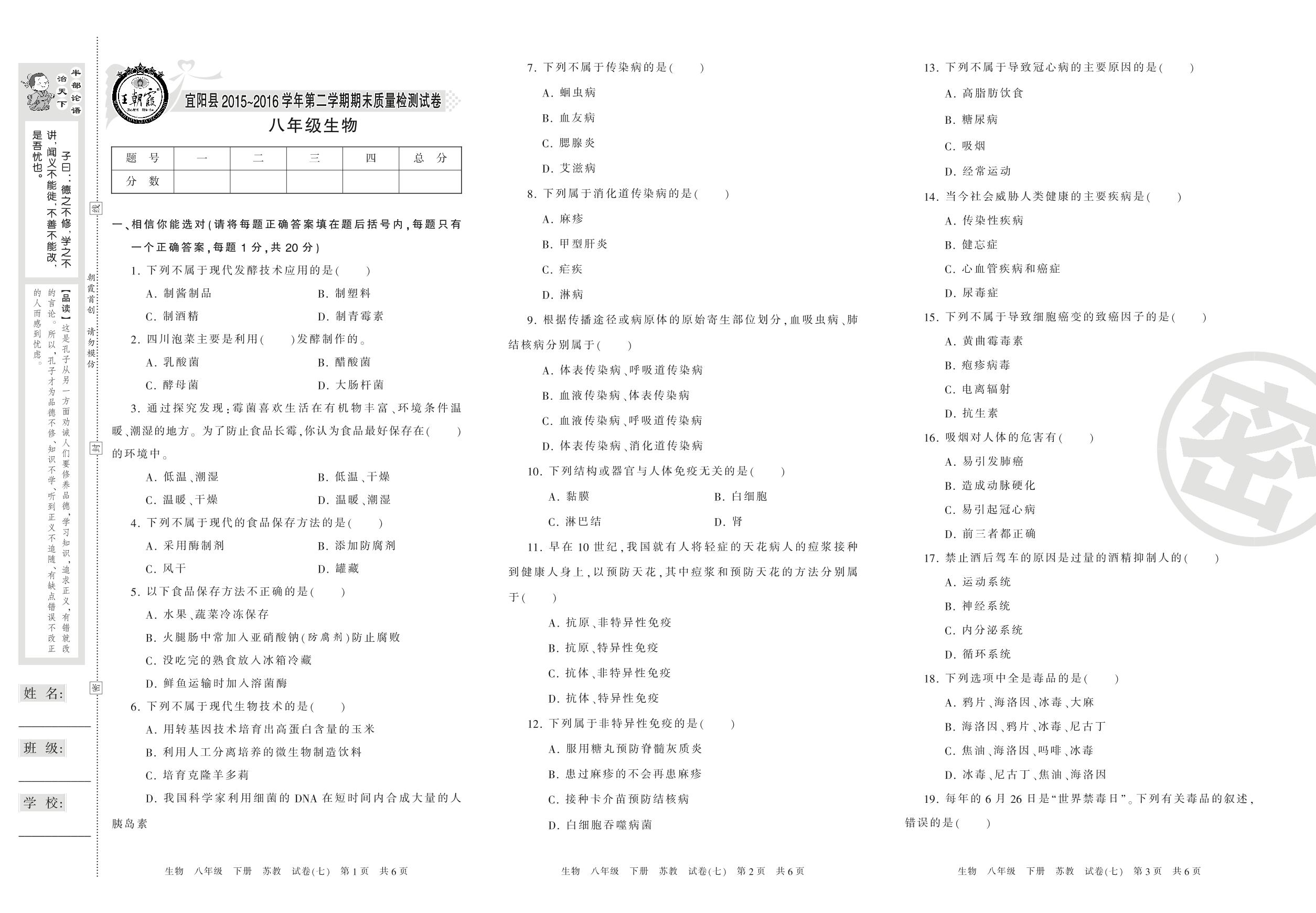 2015-2016学年第二学期洛阳市宜阳县八年级生物试卷(苏教版)【7】