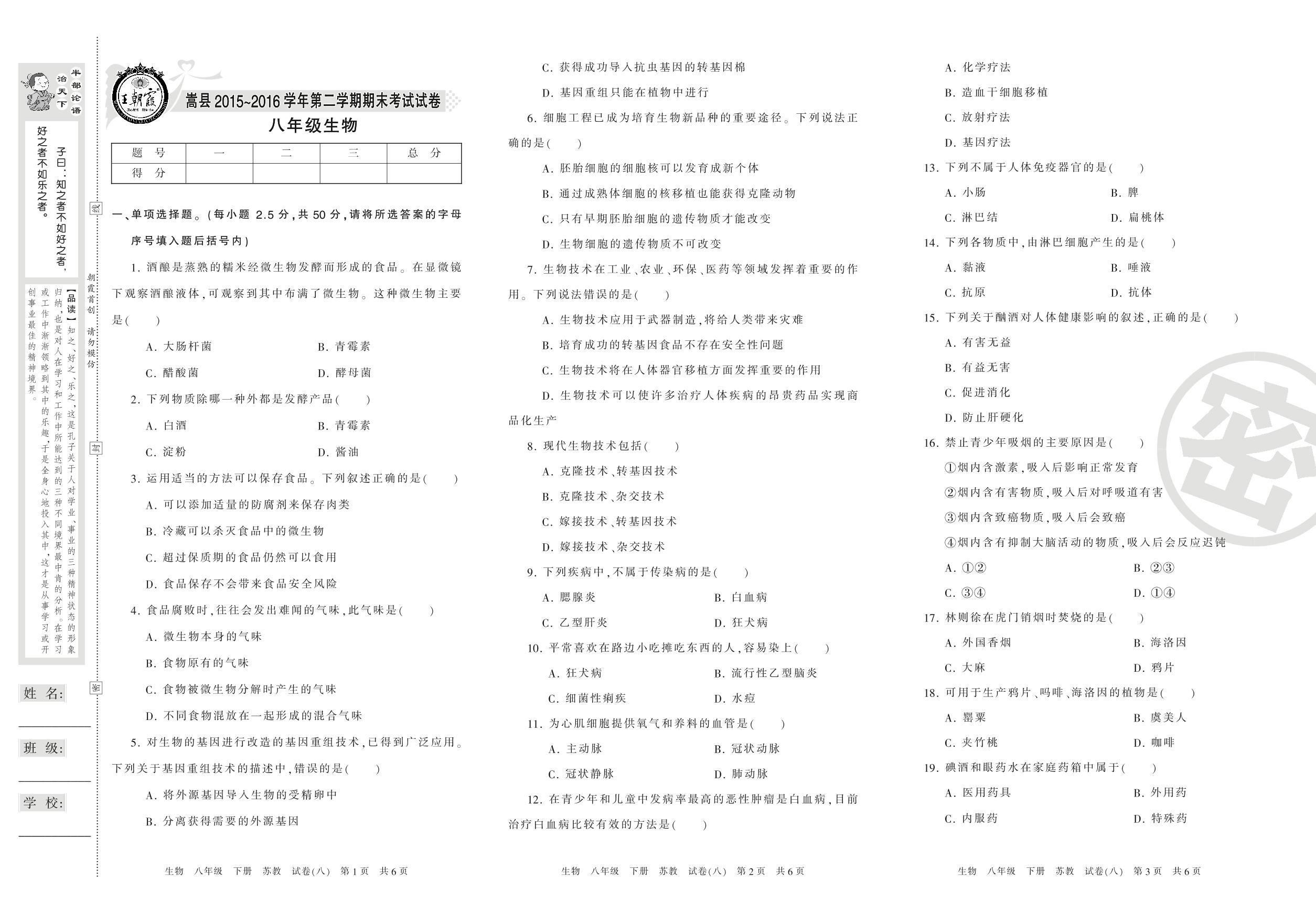 2015-2016学年第二学期洛阳市嵩县八年级生物试卷(苏教版)【8】