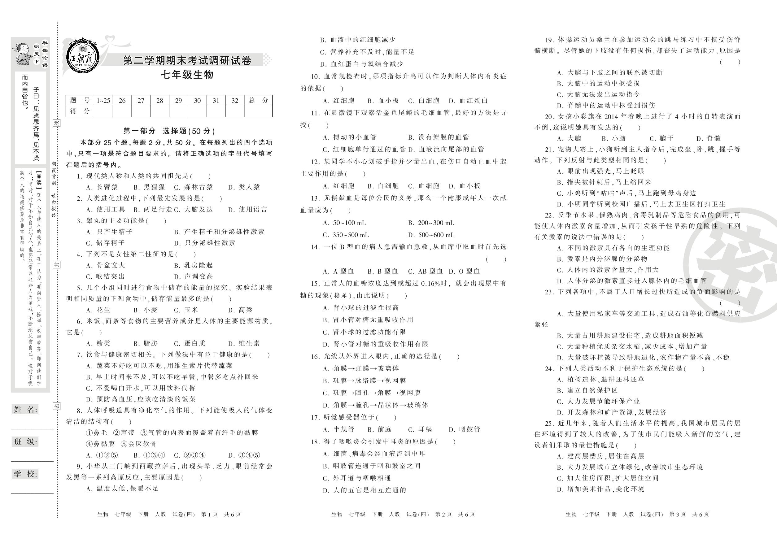 王朝霞期末调研卷七年级下册生物(人教版)【4】