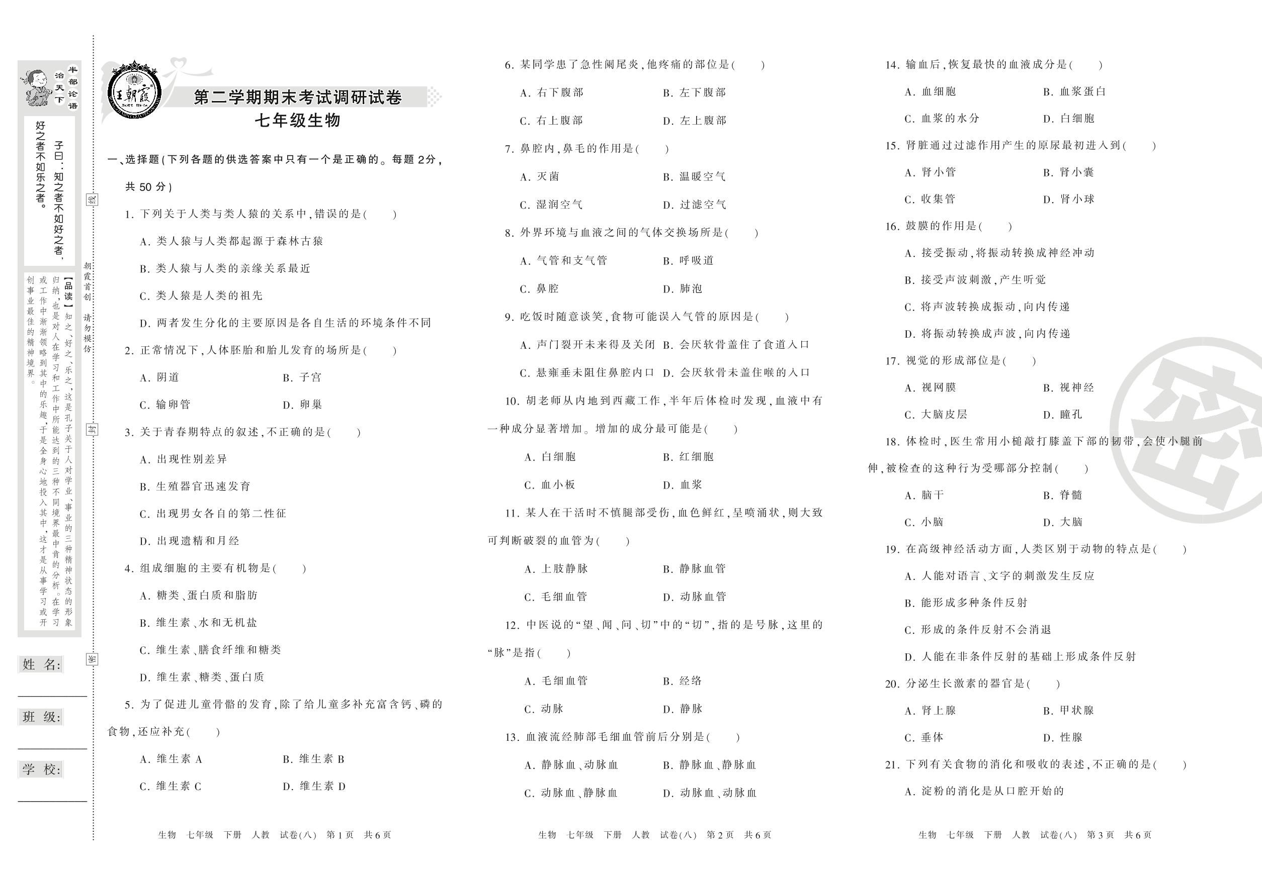 王朝霞期末调研卷七年级下册生物(人教版)【8】