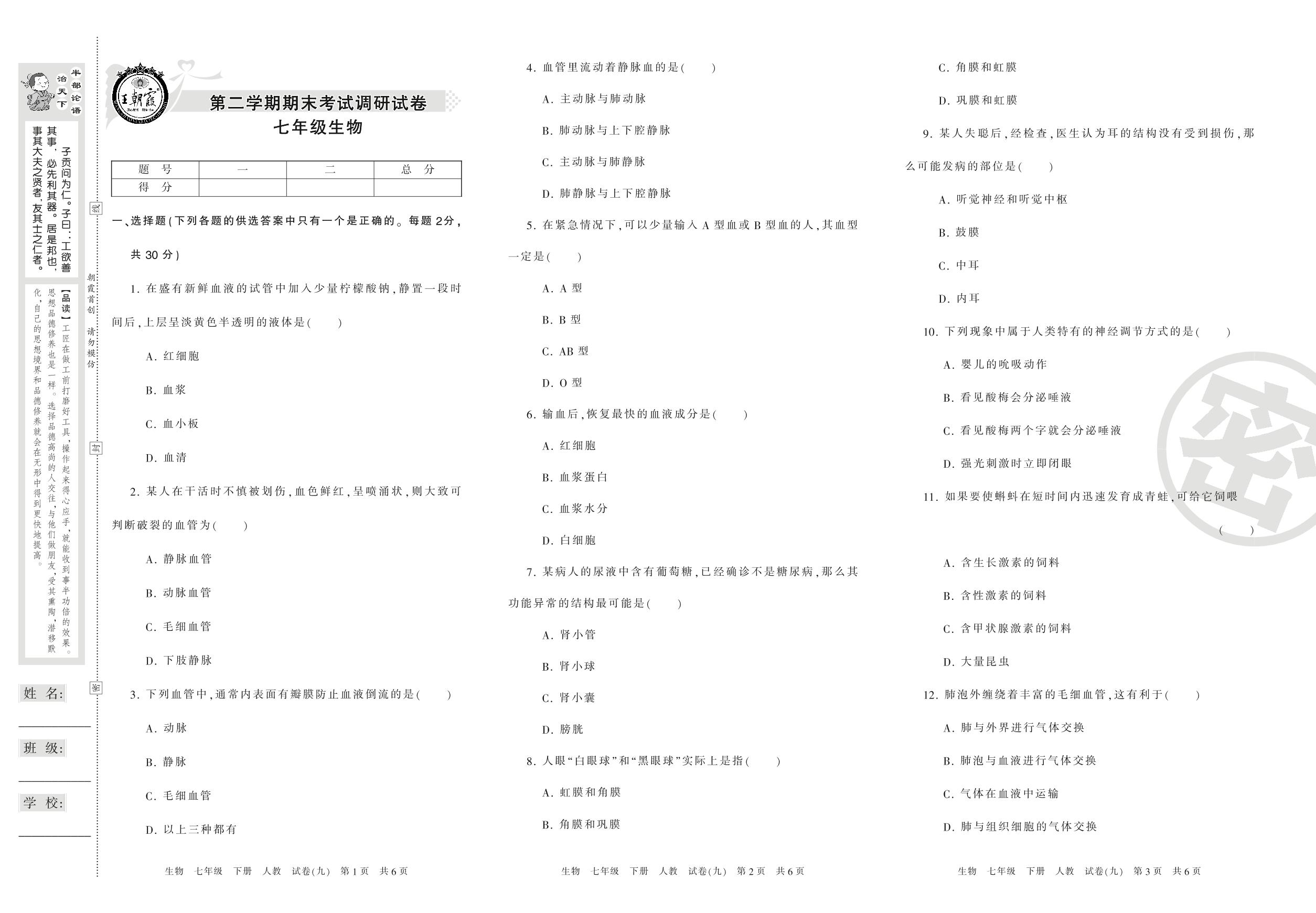 王朝霞期末调研卷七年级下册生物(人教版)【9】