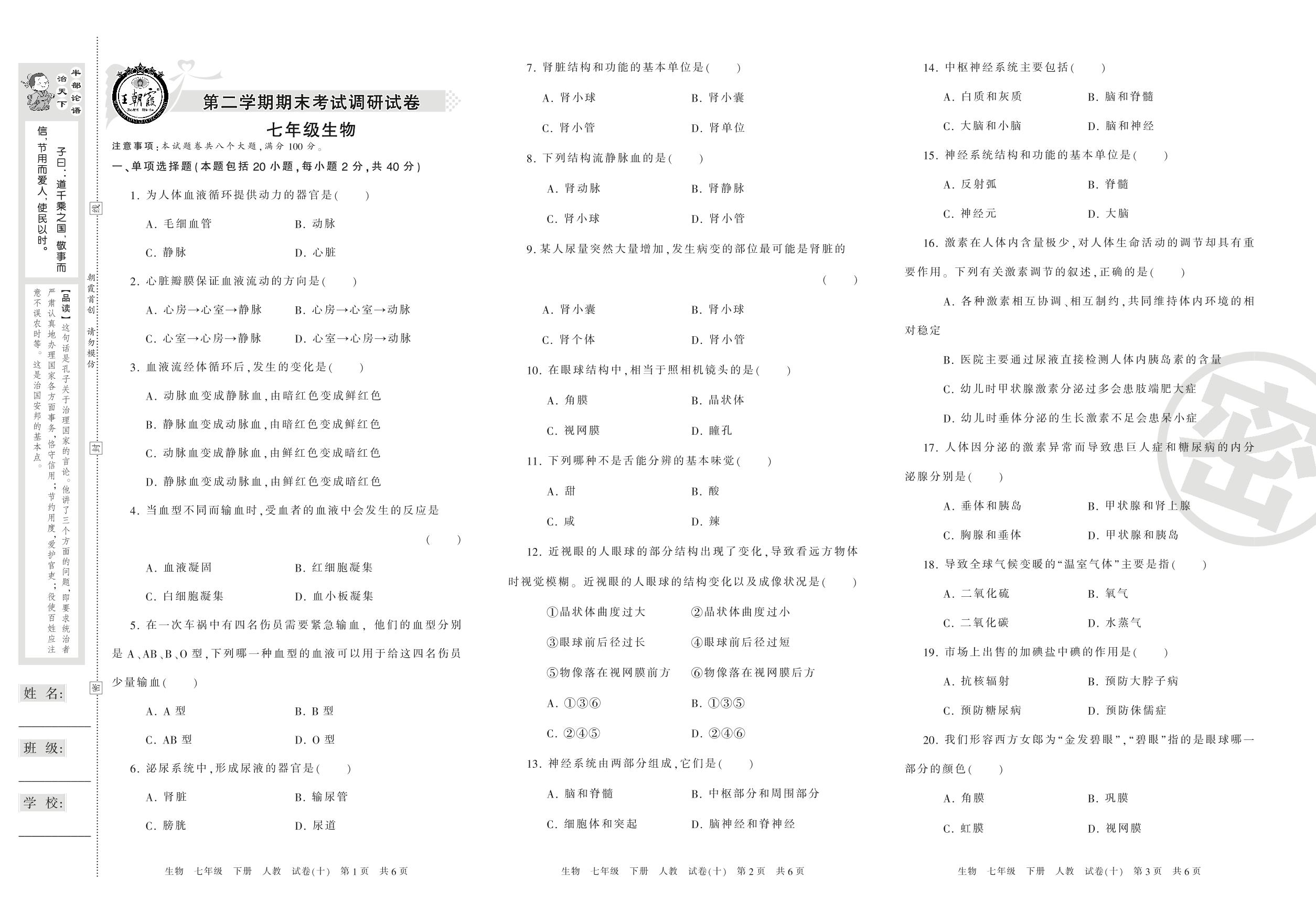王朝霞期末调研卷七年级下册生物(人教版)【10】