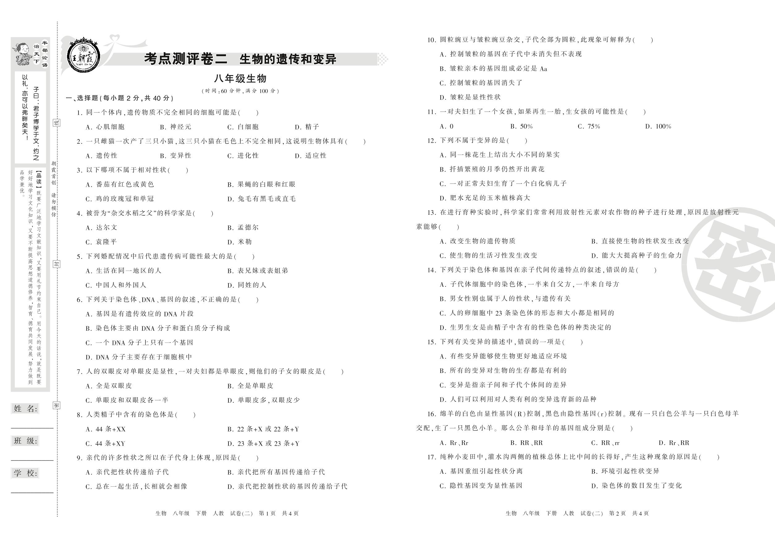 八年级生物人教版下册期末卷