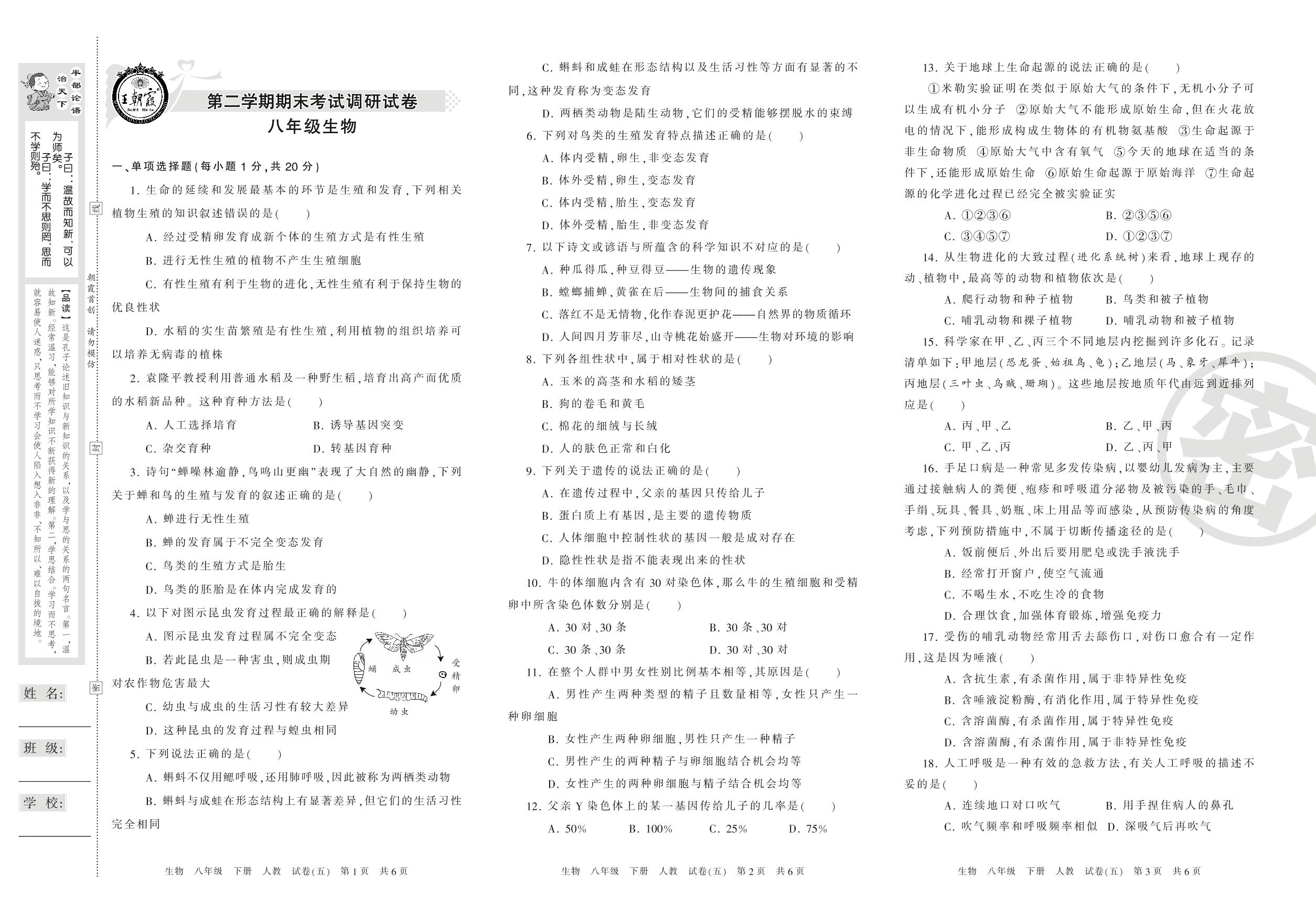王朝霞期末调研卷八年级下册生物(人教版)【5】