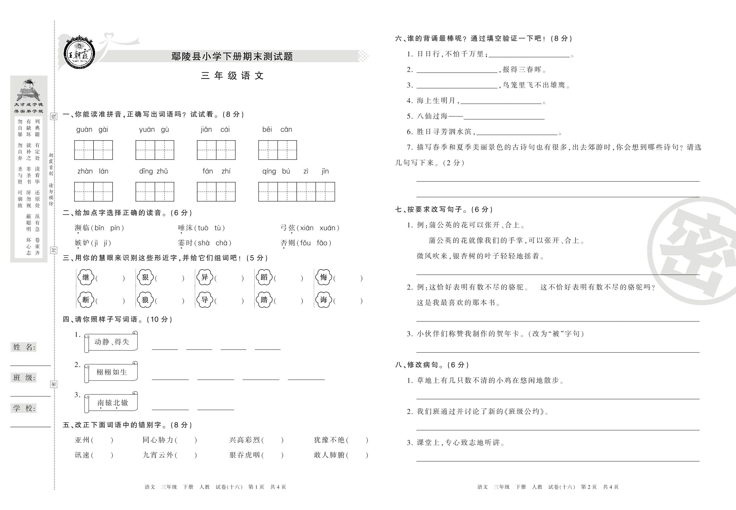 三年级语文人教版下册期末卷