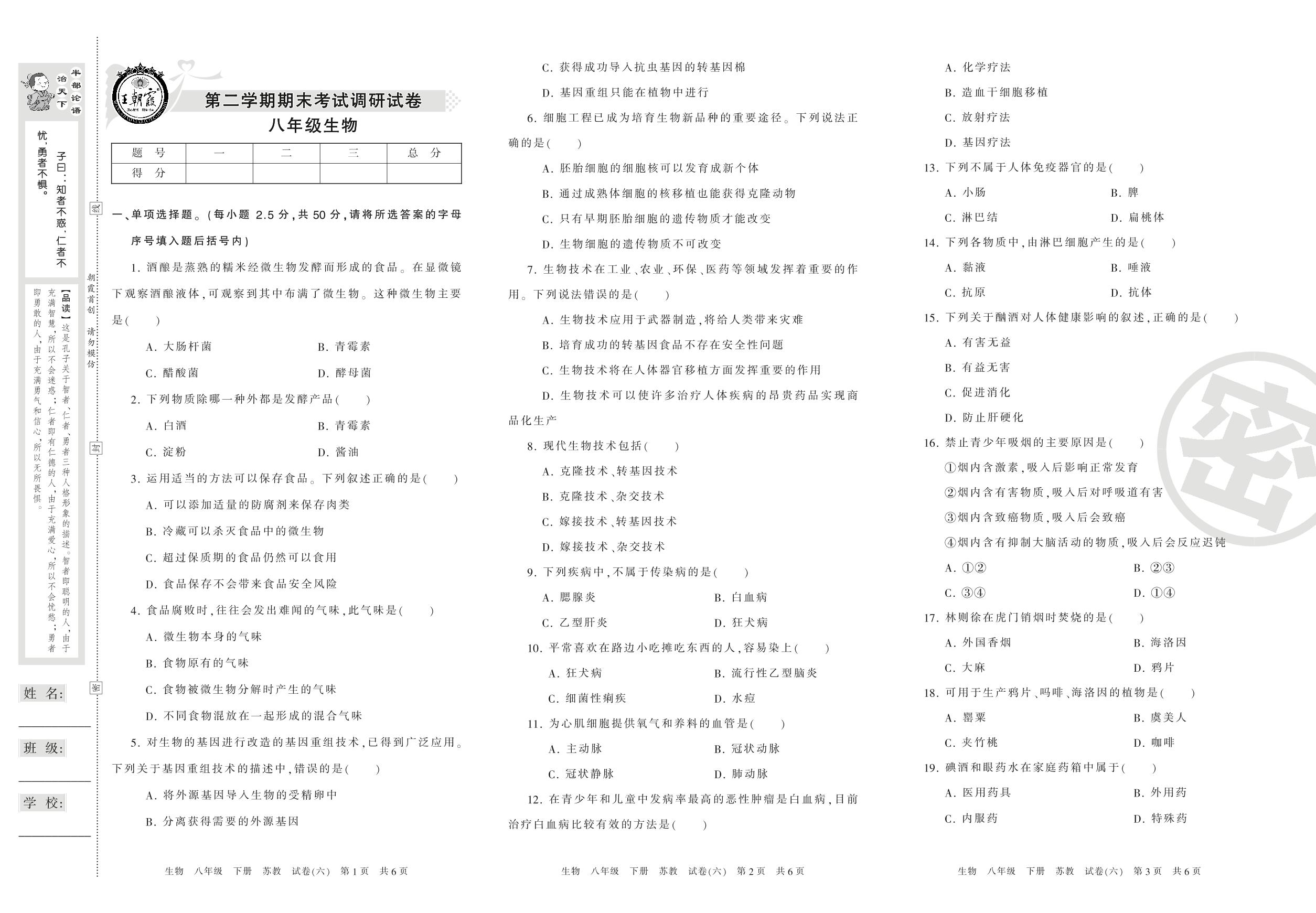 调研试卷八年级下册生物(苏教版)【6】