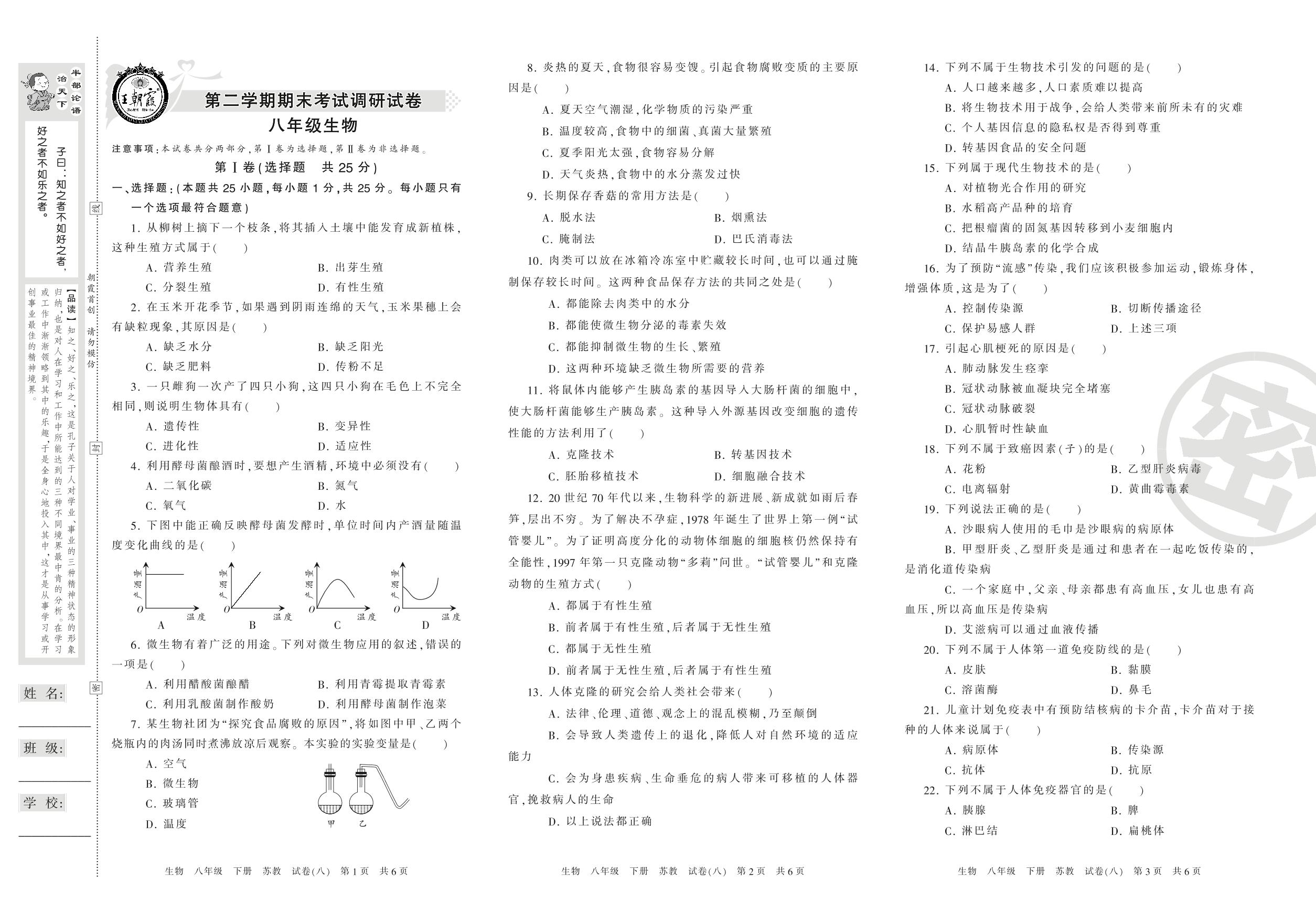 八年级生物苏教版下册期末卷