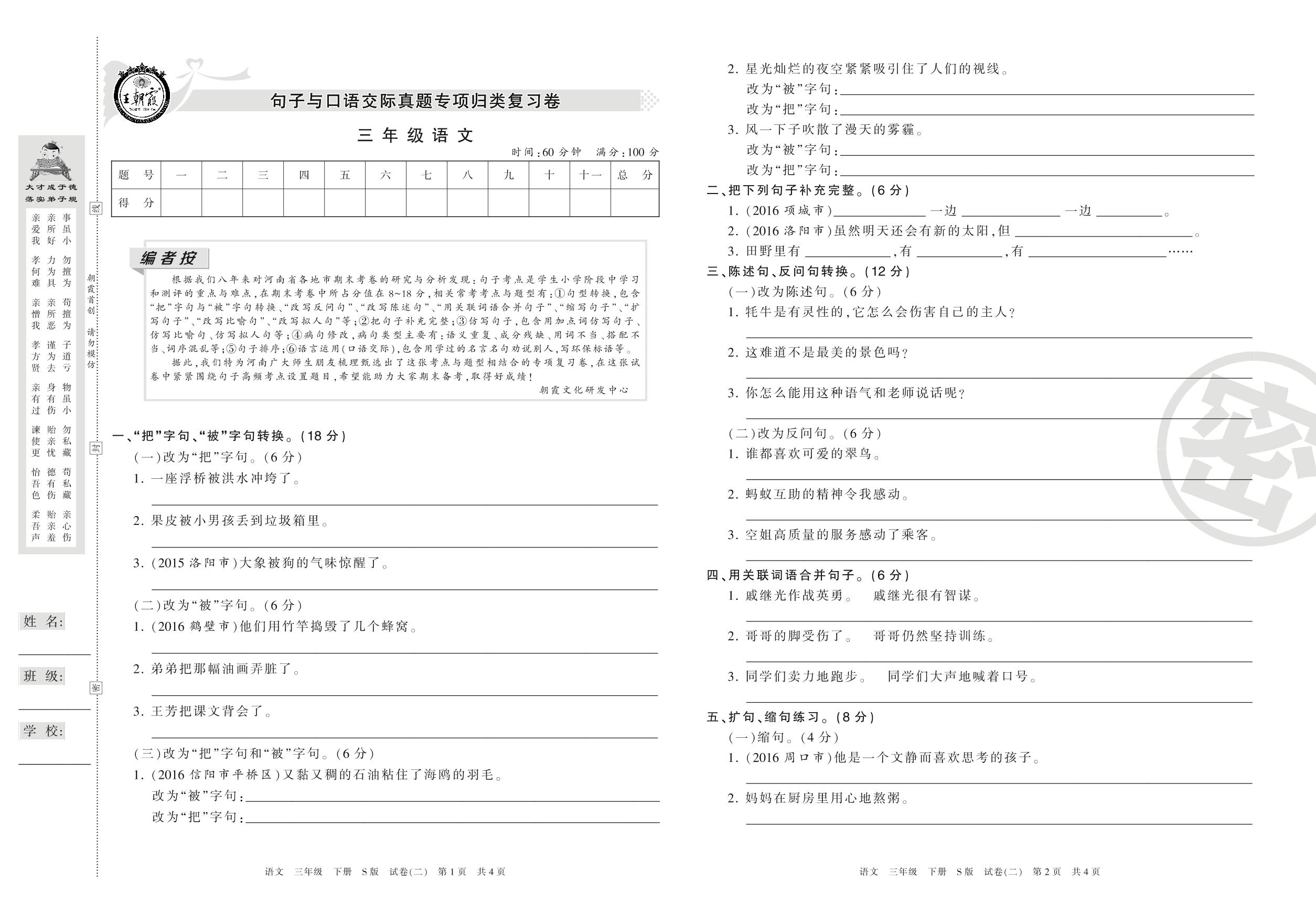 王朝霞期末专项卷三年级下册语文(S版)_R21080195006【2】
