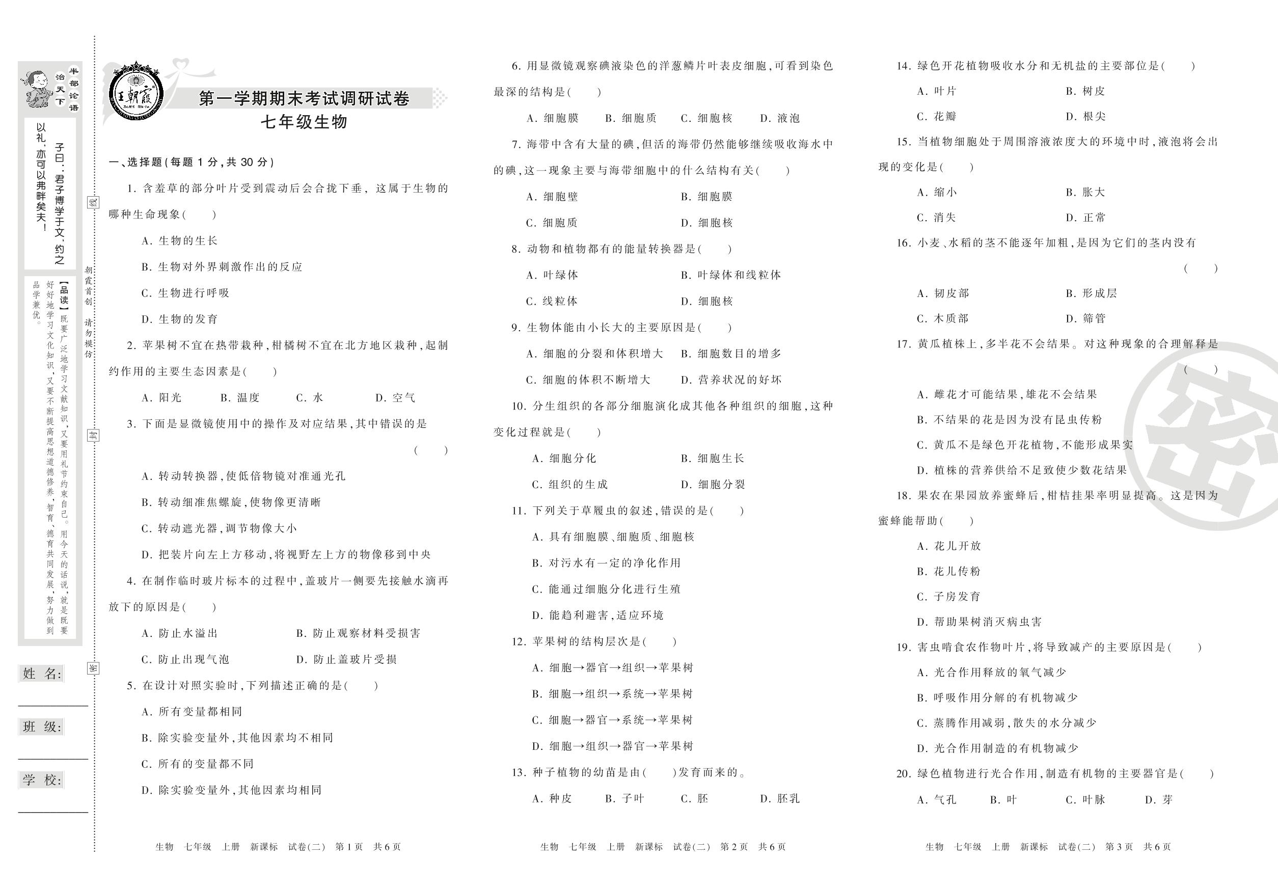 王朝霞期末调研卷七年级上册生物(新课版)【2】