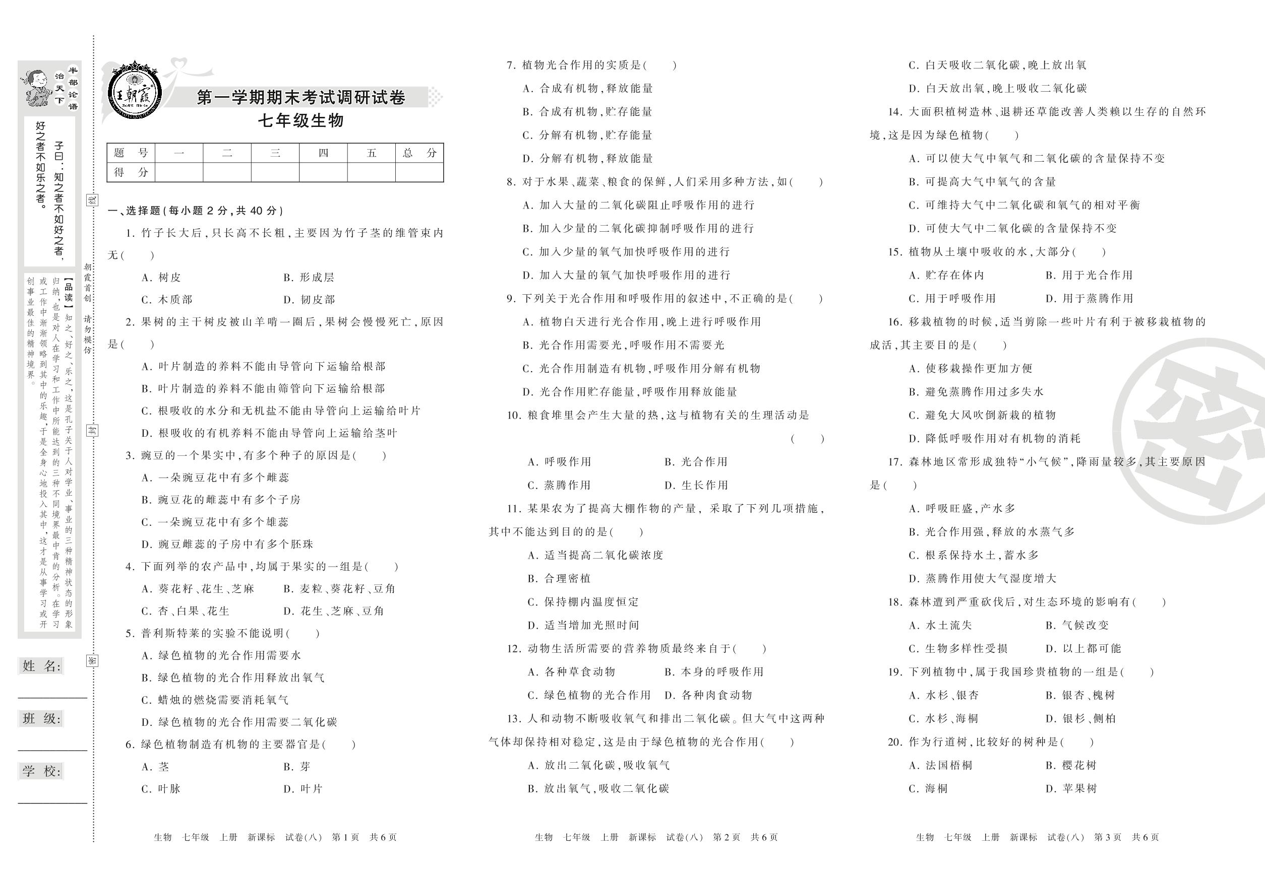 王朝霞期末调研卷七年级上册生物(新课版)【8】
