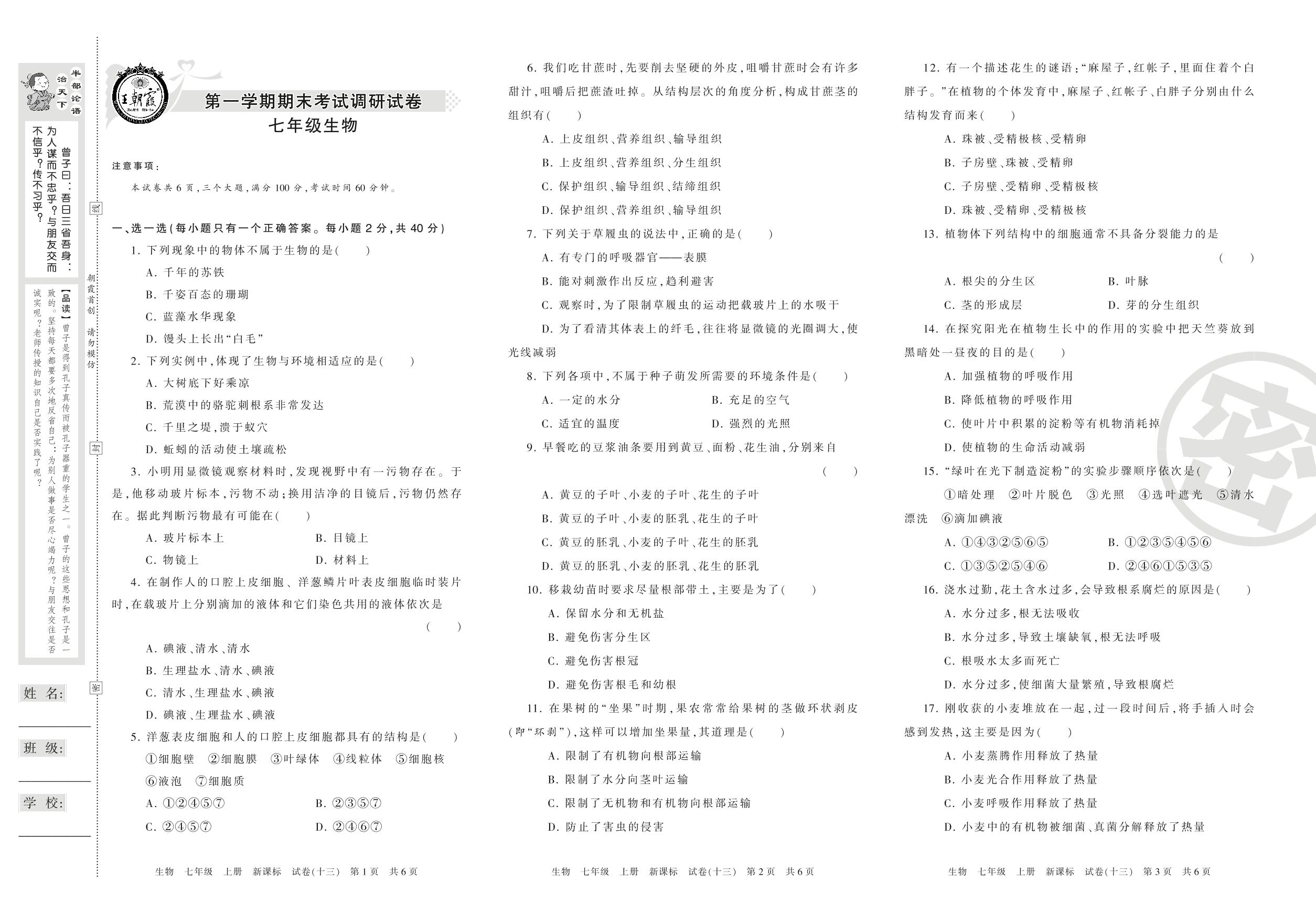 七年级生物新课标版上册期末卷