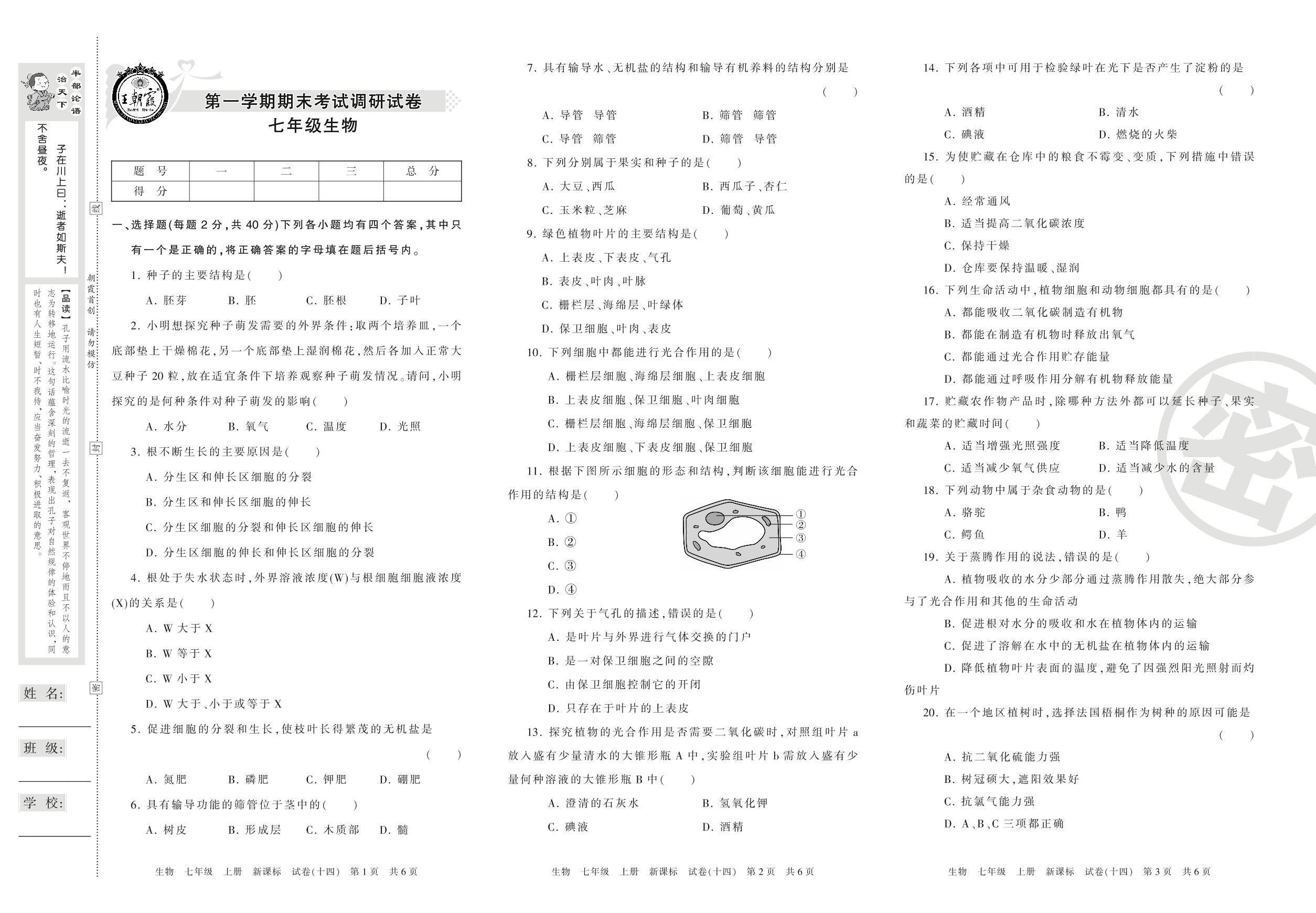 王朝霞期末调研卷七年级上册生物(新课版)【14】