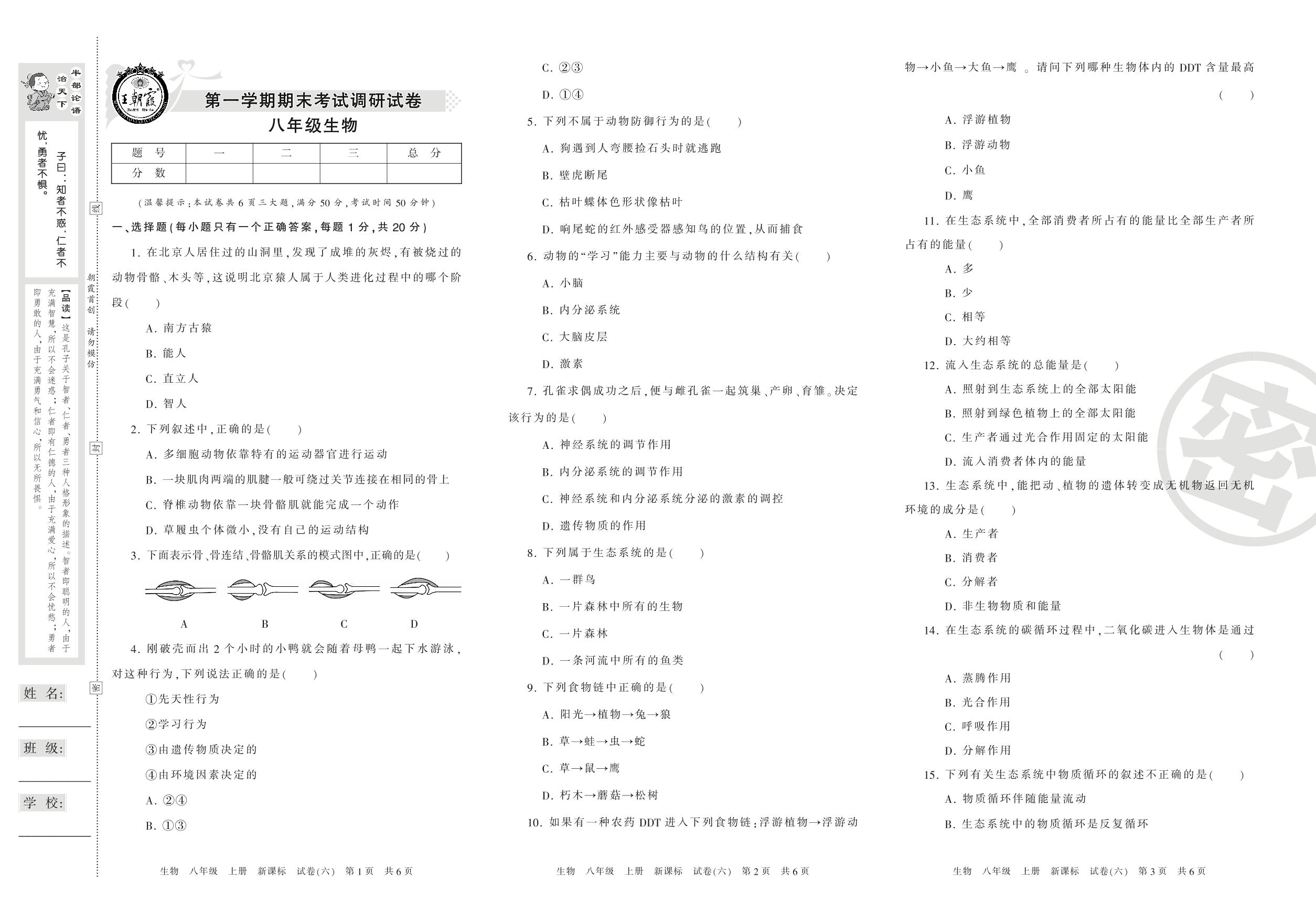 王朝霞期末调研卷八年级上册生物(新课版)【6】